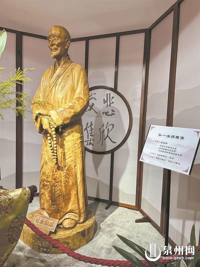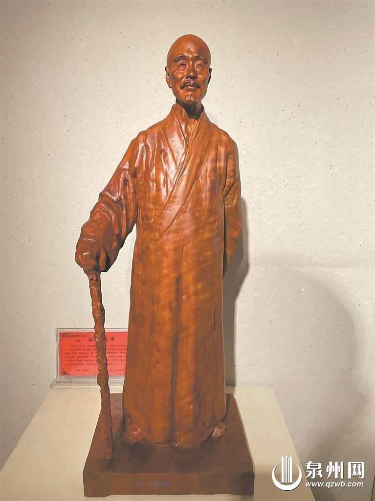 在千年古刹石狮金相院,那伽阁曾是弘一大师的居所,如今建成弘一大师纪念室。一入门,就可见一尊直径80厘米、高度210厘米的弘一大师香樟木雕像,挺直站立,手拿佛珠,眼神深邃,嘴角微扬。淡淡樟木香萦绕其间,观之令人心静神宁。