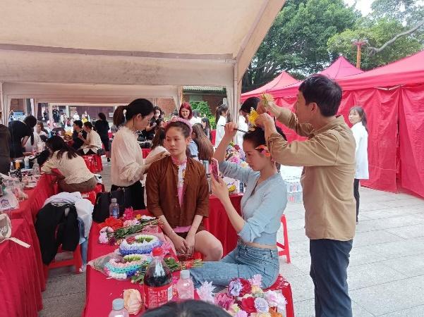 此外,实践团还根据安溪当地的实际状况,充分发挥新材料与鞋服工程学院纺织、服装等专业特长,联合蟳埔女服饰黄晨大师工作室团队开展当下流行的“蟳蜅女簪花围头饰”和布艺贴画制作工艺培训。