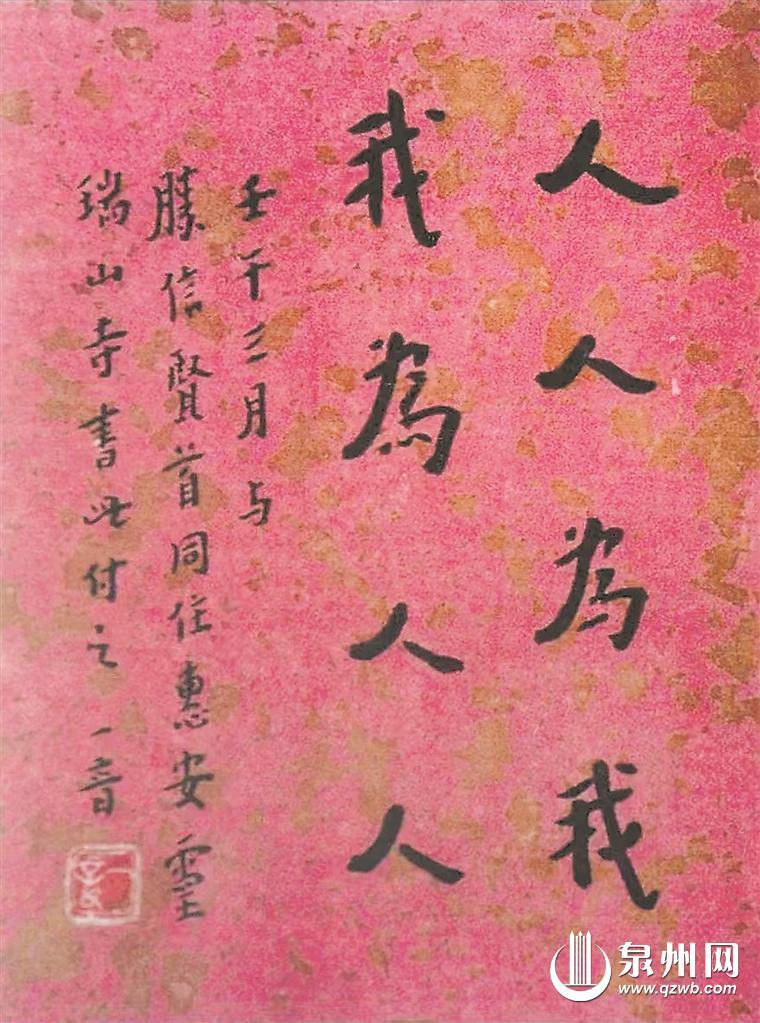 弘一大师在惠安灵瑞山寺手书“人人为我 我为人人”