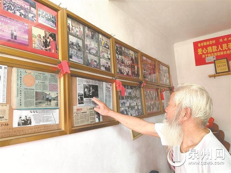 走进陈老伯居住的古大厝,沿着长廊进入一间泡茶室,三面白墙上挂满了用相框裱起的剪报和老照片。记者看到,剪报已有些发黄变硬,上面用文字标注着捐款时间和金额,其中不乏来自本报的报道,每一篇都被他精心裁剪,整齐排列;另外一些老照片也显露出了岁月的痕迹,照片里满是陈老伯与不同受助学生沟通交流的画面,无声地记录着他20余年捐资助学的温情岁月。