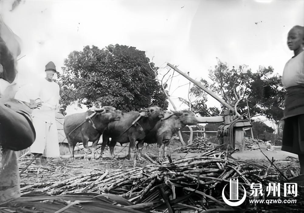 农业是中国封建社会最主要的生产部门,在19世纪末和20世纪初,大多数农民依旧驱赶着牲畜劳作。从图片中可以看到,农民正赶着三头水牛,令其拉磨碾榨甘蔗,让石磨压榨出甘蔗汁,再经提纯得到蔗糖。农民在夏秋两季收割稻子,在老式打谷机上摔打稻穗,让谷粒脱落,再通过石磨盘和木杵对干燥后的谷物进行碾压,筛去米糠,白米就脱壳而出了。如果追求饮食的精细,还可以用石磨碾磨糯米,得到糯米粉,制成极具闽南特色的红圆等小吃。