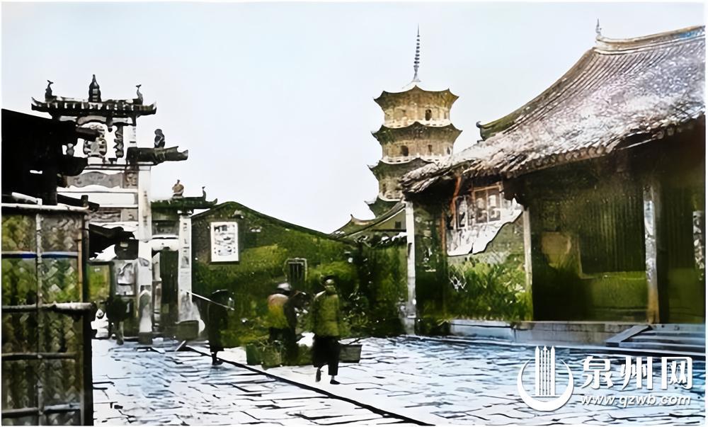 商业方面,1888年清末的泉州西街,一大早,几个百姓就挑着竹箩,从石板街上走过,穿过画面左边的一座牌坊,要去做买卖。画面右边这座大厝是开元寺的天王殿,当时开元寺还未经过修缮,部分墙皮脱落,屋顶的瓦片也存在不同程度的破损,位于牌坊和天王殿中间的石塔是西塔仁寿塔。