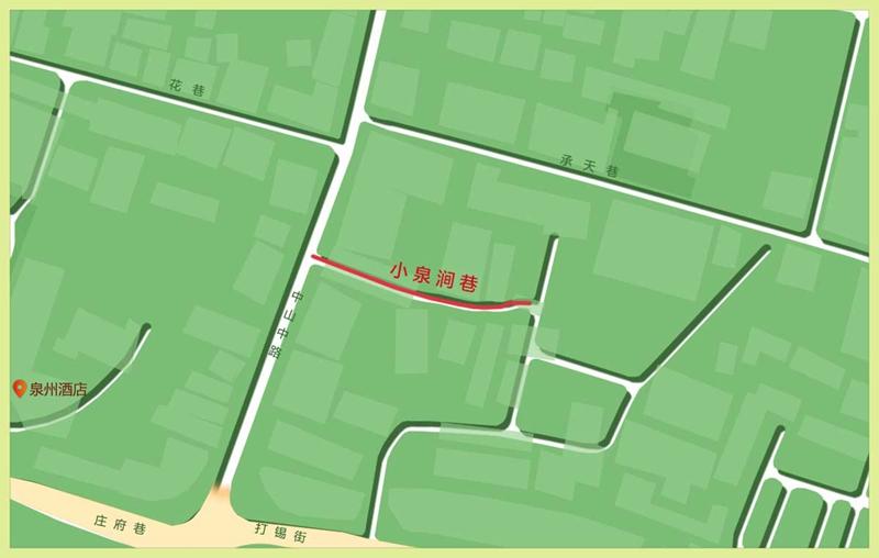 泉州市鲤城区小泉涧巷,旧时巷中曾有一条小水沟,称为小泉涧,巷子因此得名。小泉涧巷南侧的打锡街,旧时有大水沟流过,因此名为大泉涧巷,后来经历了打锡巷、打锡街的演变,而小泉涧巷的巷名保留至今。