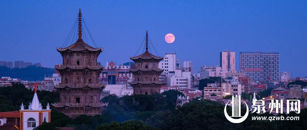 在泉州,中秋不仅有“笋江泛月”的诗情画意,也有月映双塔的动人景色。(陈起拓 摄)