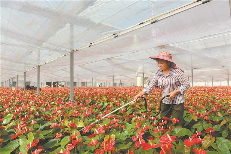 眼下,上涌镇下涌村的丰泉花卉产业基地里,一片绚烂火红的红掌花正悄然绽放。自2021年落成以来,该基地大力发展红掌种植,凭借智能化管理和技术改革创新,实现了产量的稳步提升。