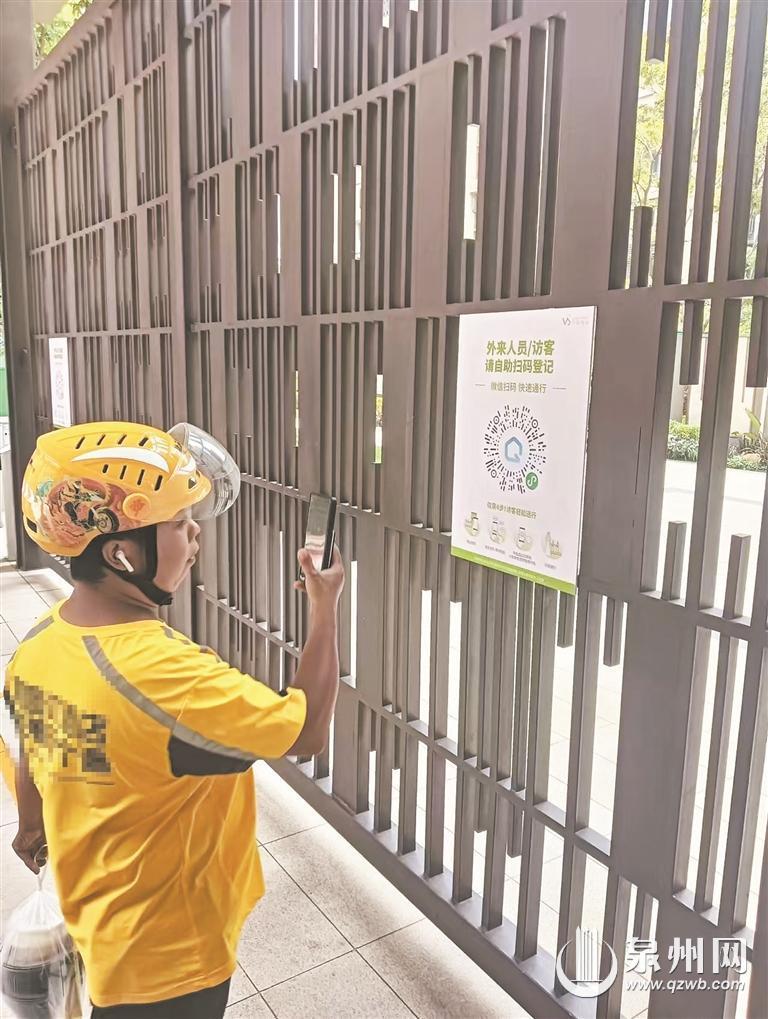 昨日上午11时许,在晋江万科悦城二期的大门口,外卖骑手小苏正用手机扫描墙上的小程序码,进入小程序后,选择“确认进行验证”授权手机号,页面系统很快生成一个通行码,小苏凭码扫门禁系统即可进入小区送餐,前后耗时不足10秒。