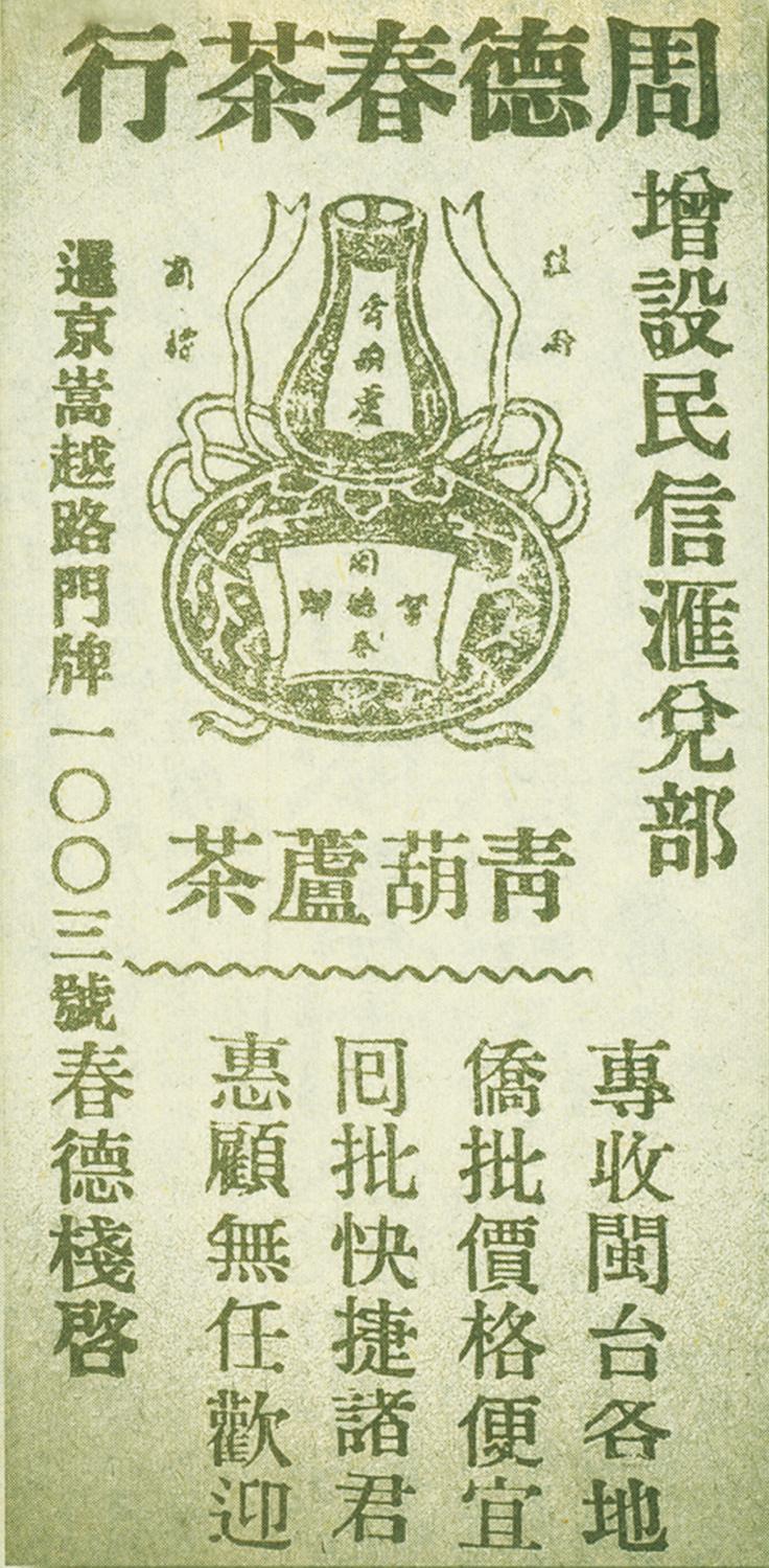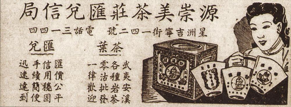 在一张新加坡老报纸上的源崇美茶庄汇兑信局广告中,一边写着“茶叶:武夷安溪,各种岩茶,零沽批发,一律欢迎”,另一边则写着“汇兑:汇价公平,信用稳固,手续简便,迅速达到”。