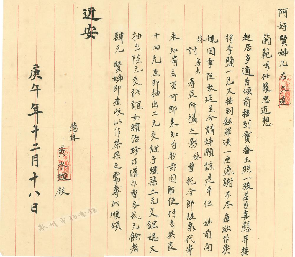 1922年,许书琏在写给妻子晋江人施氏的侨批中,请妻子劝解长辈争吵,孝顺长辈,并汇银2元。附言则说,如果方便,买些水仙种茶叶邮寄过来。
