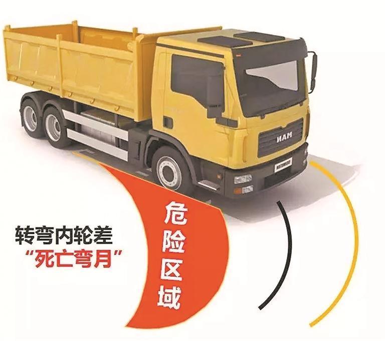 大型车辆右转时,存在“内轮差”盲区。