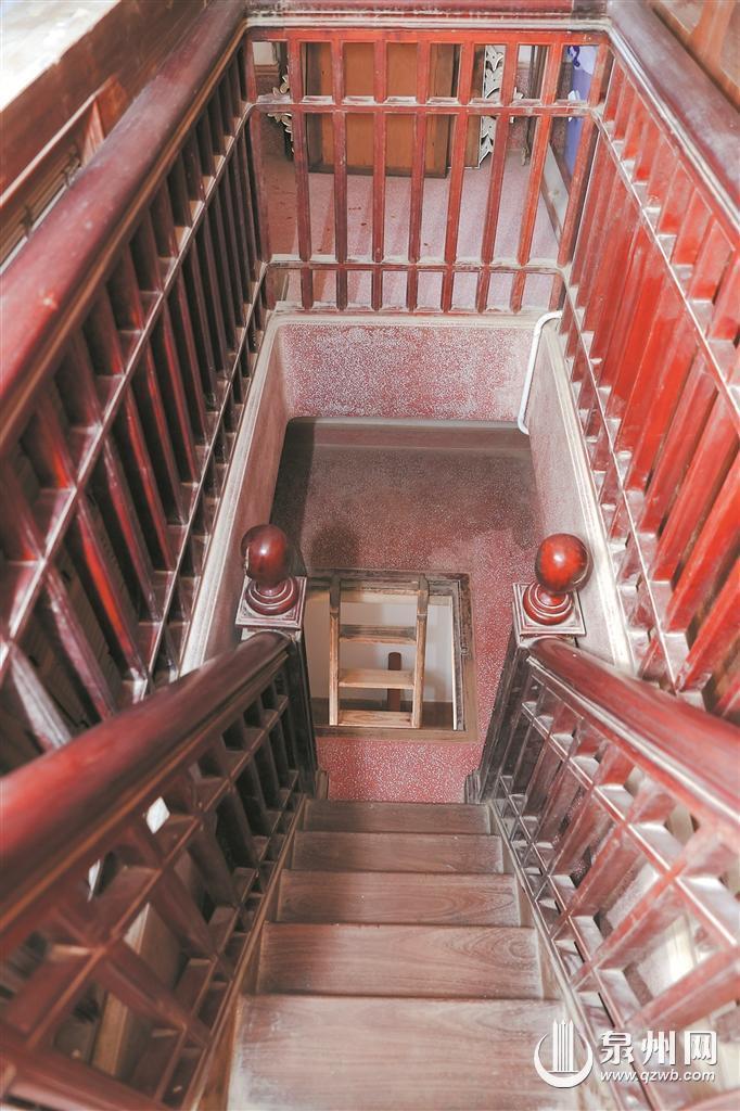 二楼的房屋结构与一楼略有不同。厅堂正中间放置八仙桌,左右两侧都为卧室,各有一个独立的小阳台,同时也可以通往二楼阳台。右室门楣上悬挂着许经撇之孙、香港著名书画家许自清所题“坚如磐石”字匾。左侧房间隔成两间,外面为起卧间,内面则为书房,现在还留存有许自清练习书法的桌椅、宣纸。叫人惊讶的是,这房间还有一扇复壁,里头有条两尺宽的暗道,通向一个狭小方洞,洞里竖着一架长长的铁梯,往下直通一楼地下一间五十多平方米的地下室。原来这是当时为了防备土匪而特地设计的逃生之道。当强盗土匪攻入家门的危急关头,可以躲避其中,以保人身安全。