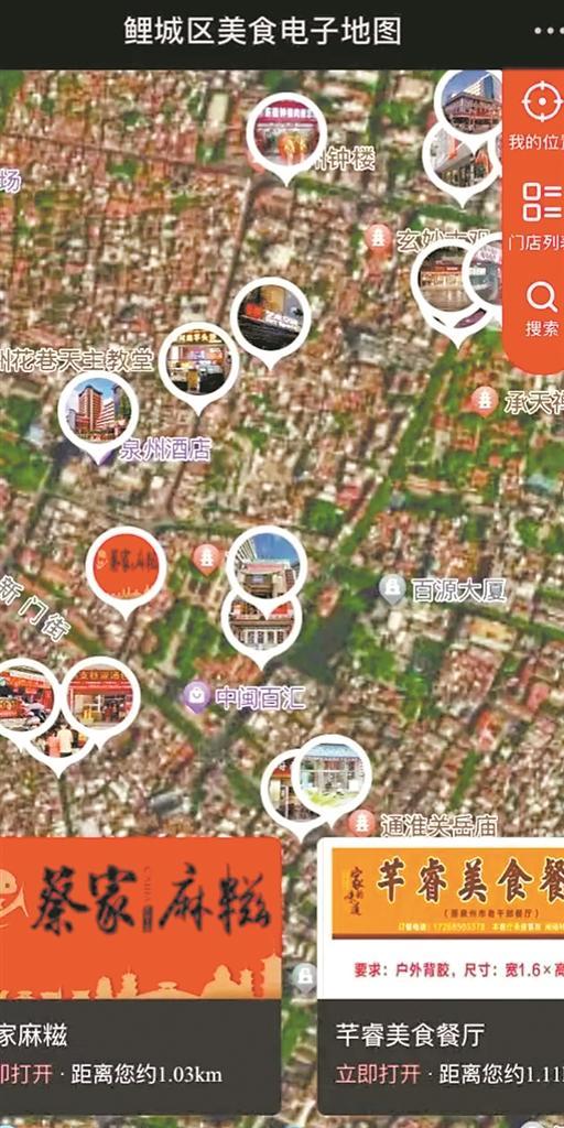 在功能模块设置方面,美食地图增设了“分类”板块,按照“最家常”“最风情”“最时尚”三个主题,对入驻的餐饮店进行分类。其中,“最家常”即本土闽南特色家常菜,“最风情”为具有异域风情元素的特色美食,“最时尚”就是当下流行、时兴的特色美食。鲤城区商务局工作人员告诉记者,目前,他们仍在不断完善美食地图的各项功能,并将继续引导商家入驻,让市民游客“一图在手”就能“吃遍古城”。