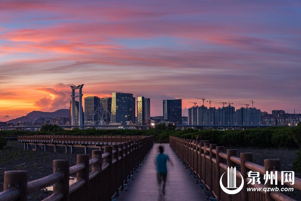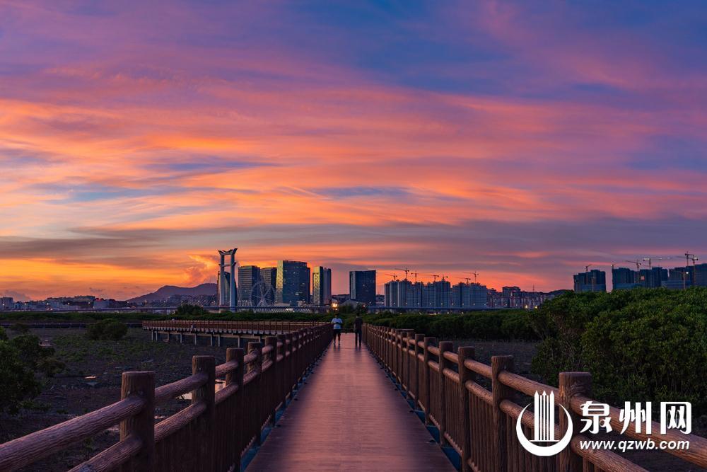 9月16日,太阳下山后,泉州市区西边至北边天空出现绚丽晚霞,为这个中秋假期增添了喜庆与祥和。图为18时17分记者在晋江南岸沿海大通道附近的步行栈道上拍摄的画面。(融媒体记者陈起拓 陈淑华 图/文)