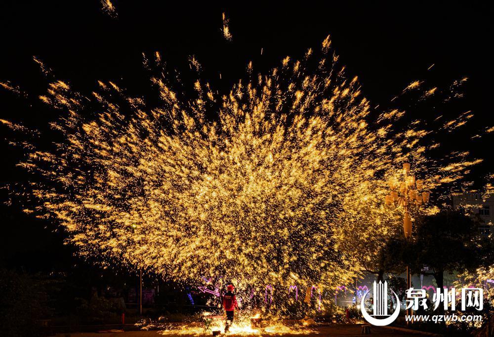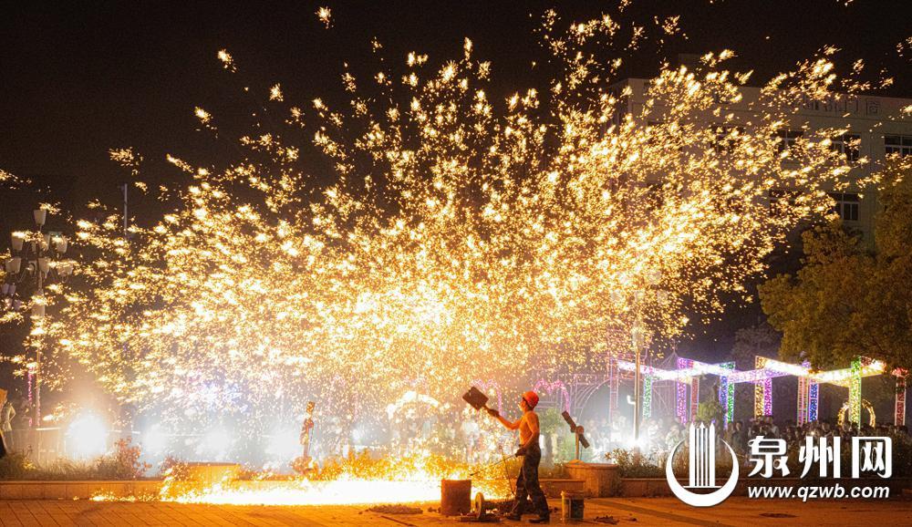 中秋佳节期间,石狮市蚶江喜盈门建材家具广场前一场盛大的非遗打铁花表演就此上演,展示了中国非物质文化遗产魅力的同时营造了浓浓的中秋氛围。(鲁之仰 彭燕珍 摄)