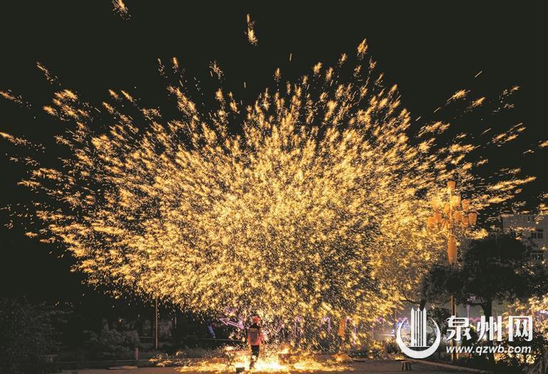 中秋佳节,石狮蚶江上演一场盛大的非遗打铁花表演,展示中国非物质文化遗产魅力的同时,营造了浓浓的佳节氛围。(鲁之仰 彭燕珍 摄)