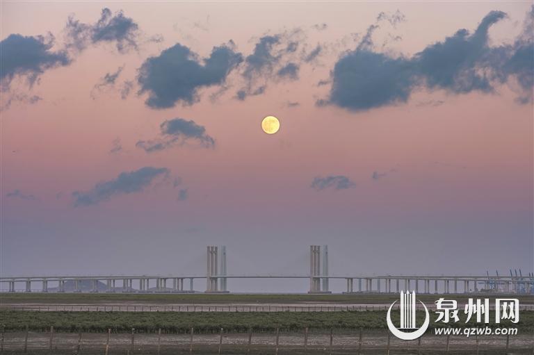 昨日是中秋佳节,一轮明亮的“超级月亮”,为这个传统佳节增添了更多浪漫色彩。记者在沿海大通道晋江一侧看到,中秋月17时50分左右现身,起初是淡淡的银色,随着高度升高,它的颜色趋向橙黄色,而后又渐渐变成皎洁的银白色。图为昨晚18时14分,月亮从泉州湾跨海大桥后方升起。(融媒体记者陈起拓 陈淑华 摄)