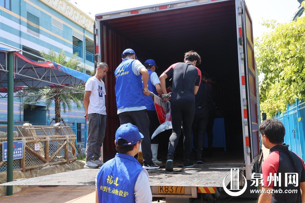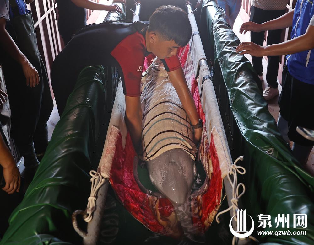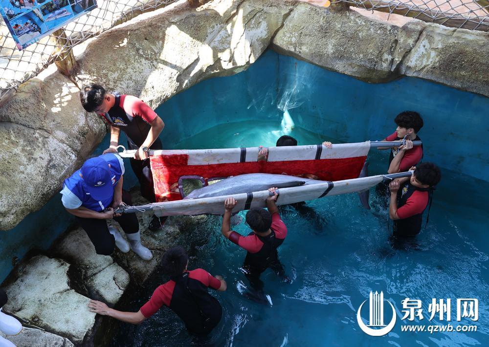 9月26日10时许,泉州欧乐堡海洋王国乐园水生野生动物救助站(以下简称“救助站”),两名壮汉叠躺在一个特制担架上,四名救助人员奋力抬起——他们正在测试担架的承重,为“乐宝”的放归做最后准备。
