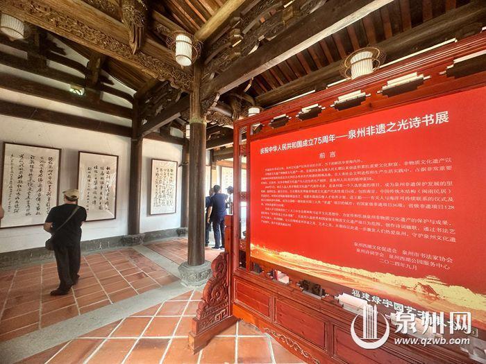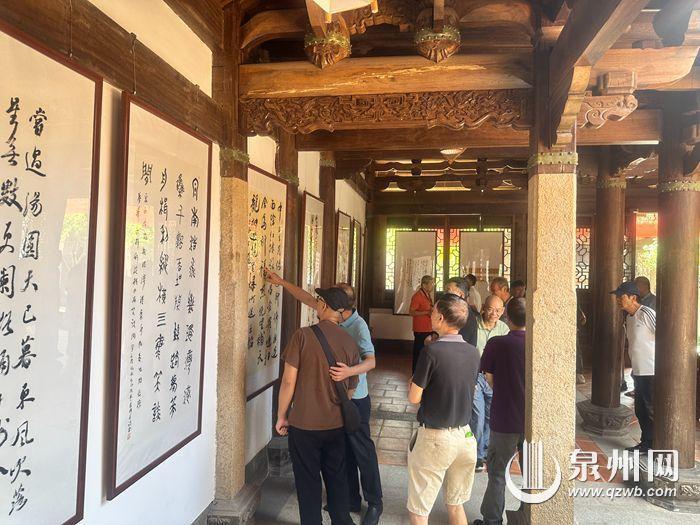 在古色古香的闽南小院内,书展上的40多件书画家的精品,让参观者一饱眼福,纷纷驻足品评。据活动方介绍,本次“泉州非遗之光诗书展”,以泉州入选世界和国家级非物质文化遗产项目为范围,创作诗词楹联,通过书法予以展示,诗书相映,让人们领略泉州非遗之美,艺术之美。并期待以此进一步激发人们热爱泉州,守护泉州文化遗产的情怀,携手共建美丽泉州。
