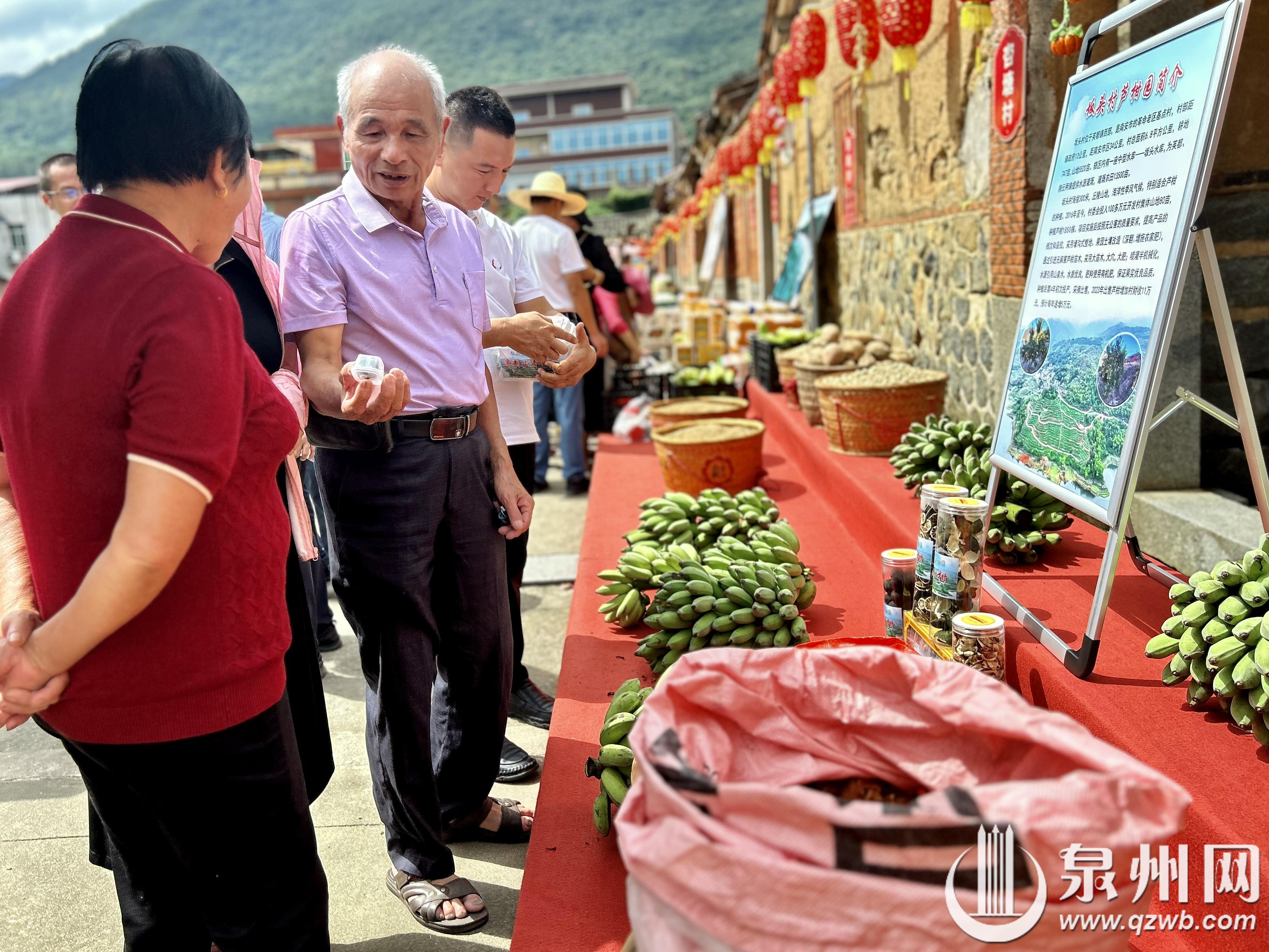 一大早,农户洪维福便带着自己种的黄晶果来到活动现场做展示,一颗颗圆润饱满的黄晶果吸引众多群众驻足询问。“我种了100多棵果树,今年迎来大丰收,共产出约2000斤果子。”他笑着说,希望通过展示,让更多人认识黄晶果,拓宽销售渠道。记者看到,现场还有芸林村的鲜龙眼、紫山村的酸笋、大新村的柚子、仕林村的红薯、坪山村的稻米、坂头村的香蕉等各色农产品,将展示台摆得满满当当。