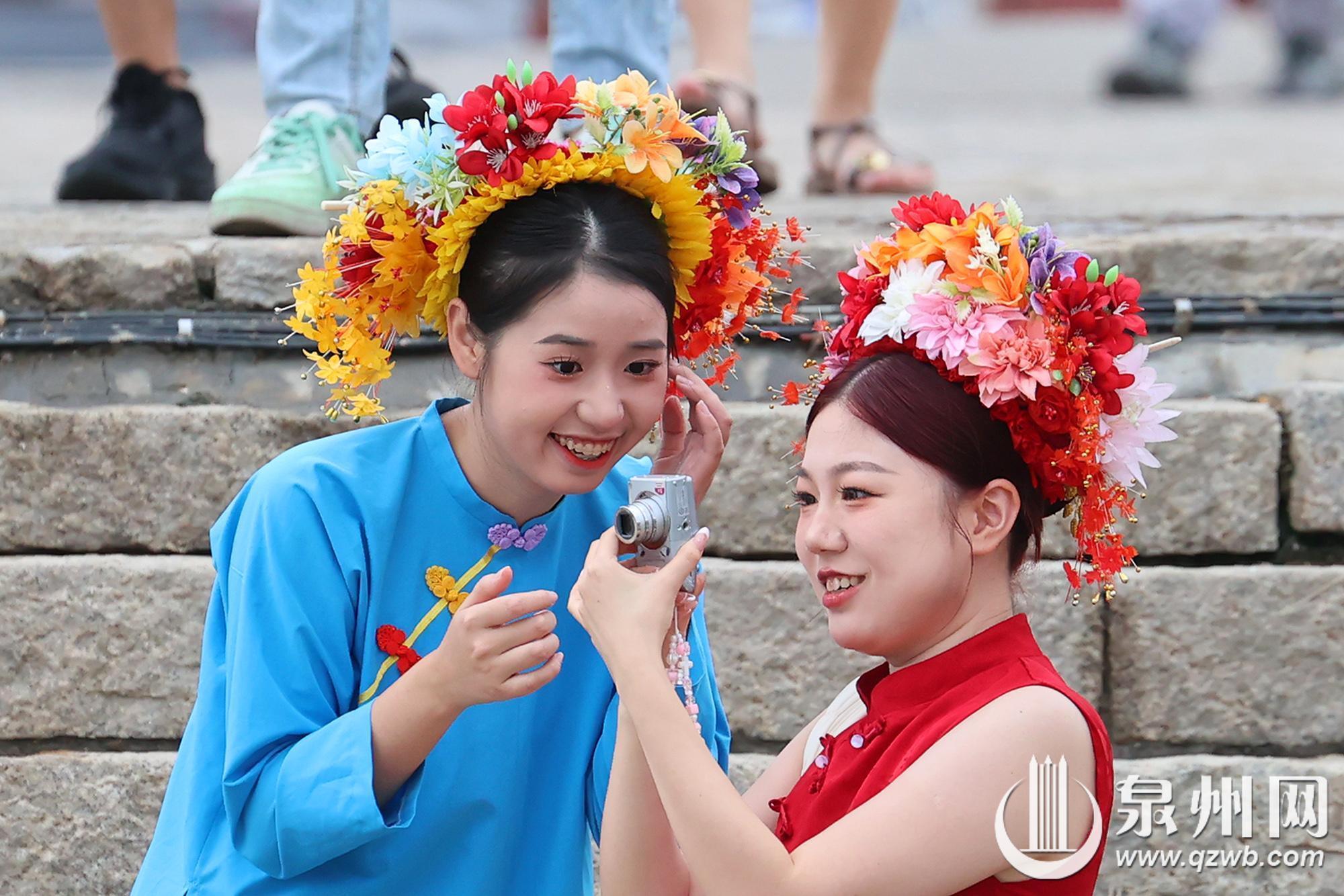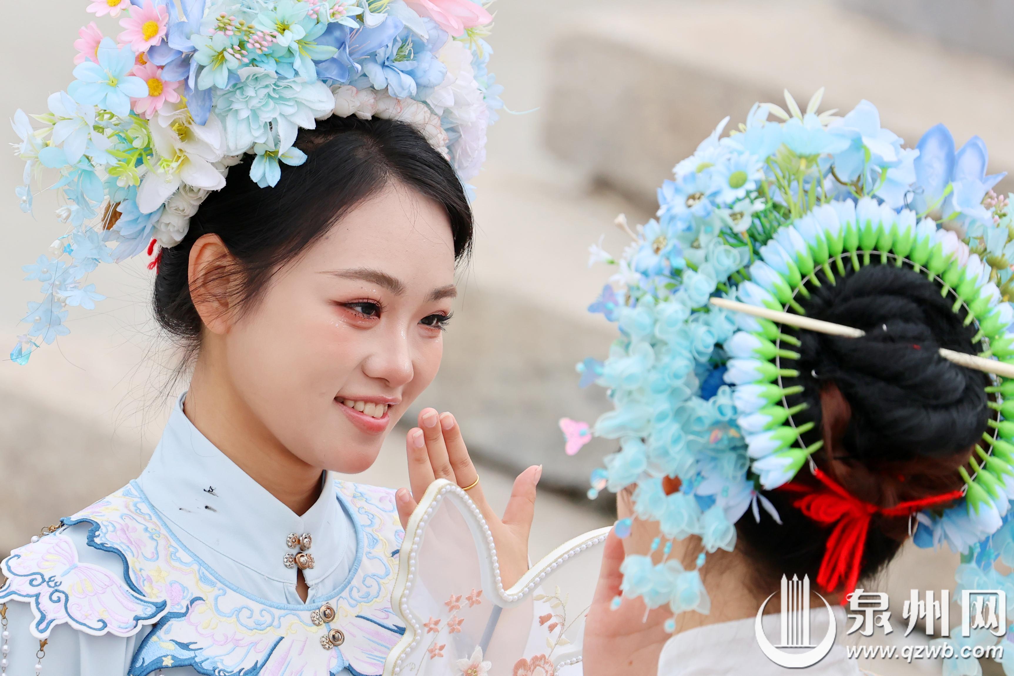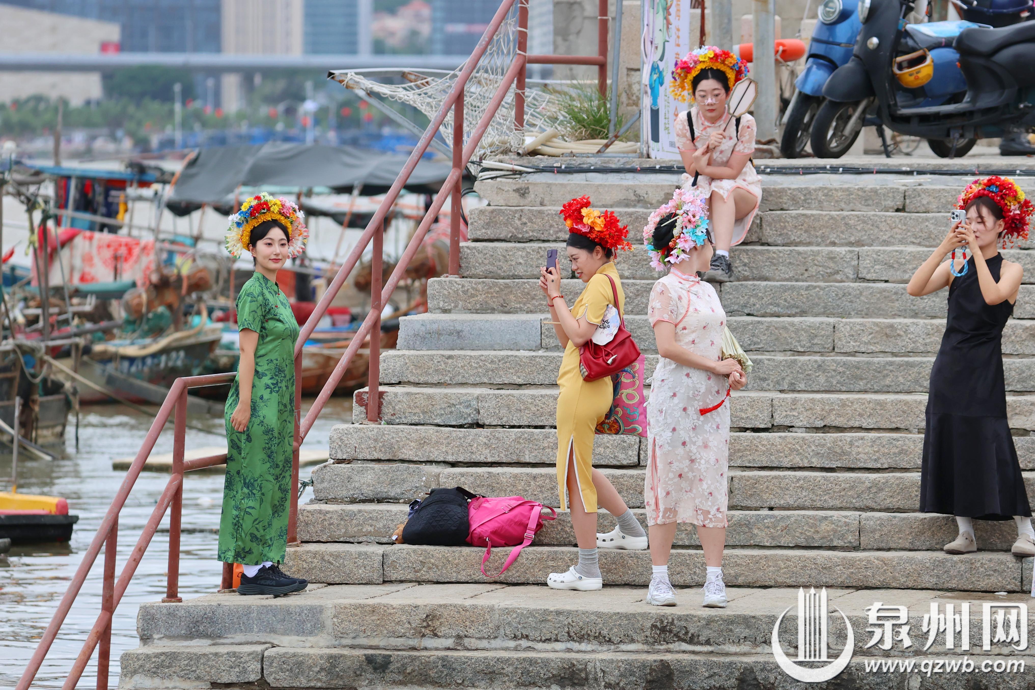 10月2日,国庆小长假第二天,一大早,泉州市丰泽区蟳埔社区的小码头暗香浮动,簪花摇曳。从各地慕名而来的爱美之人纷纷身着华丽服装,扮上精致妆容,在镜头前尽情展示自己最美的簪花围造型,留下值得回味的瞬间。(融媒体记者陈起拓 摄)