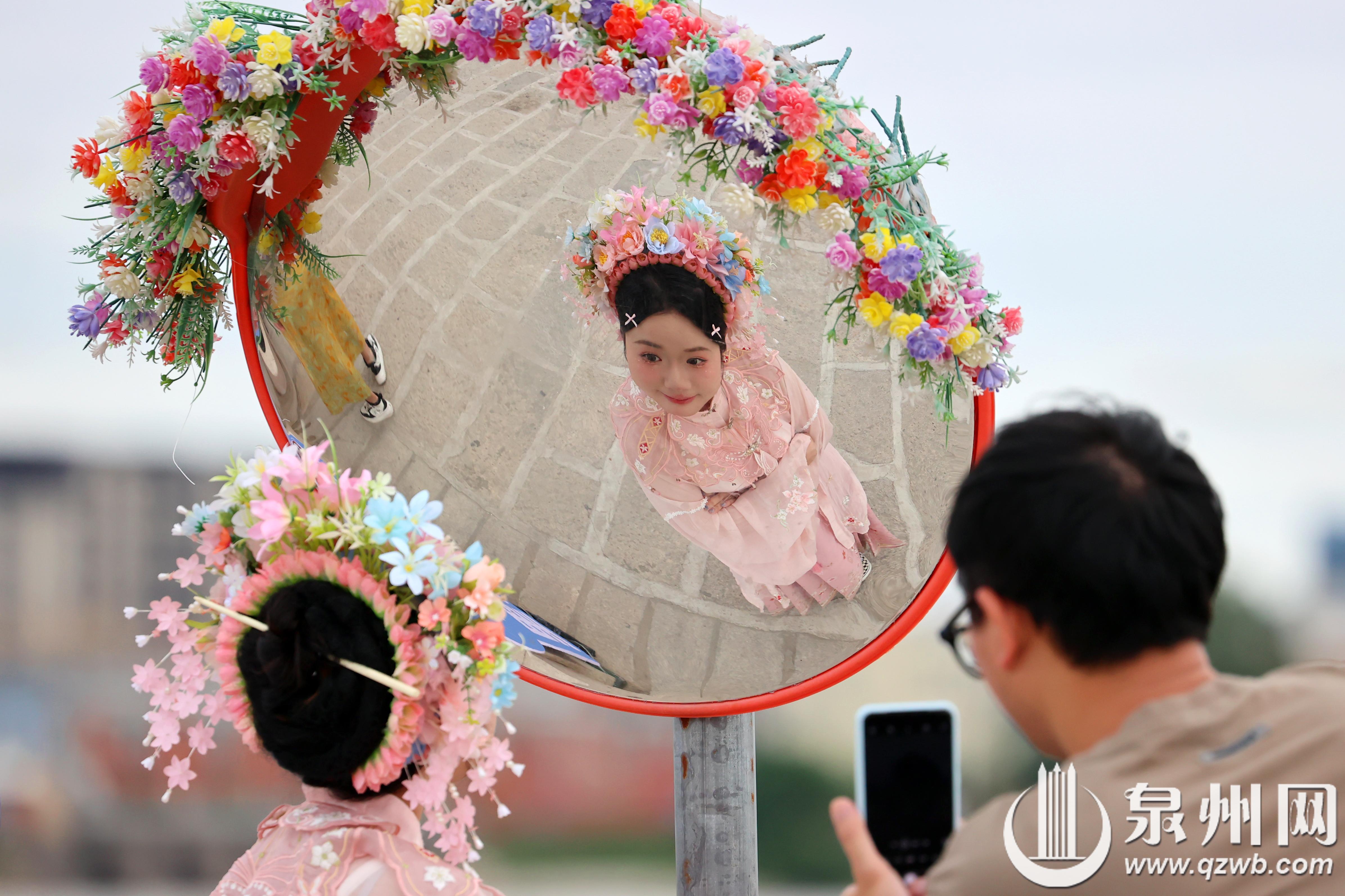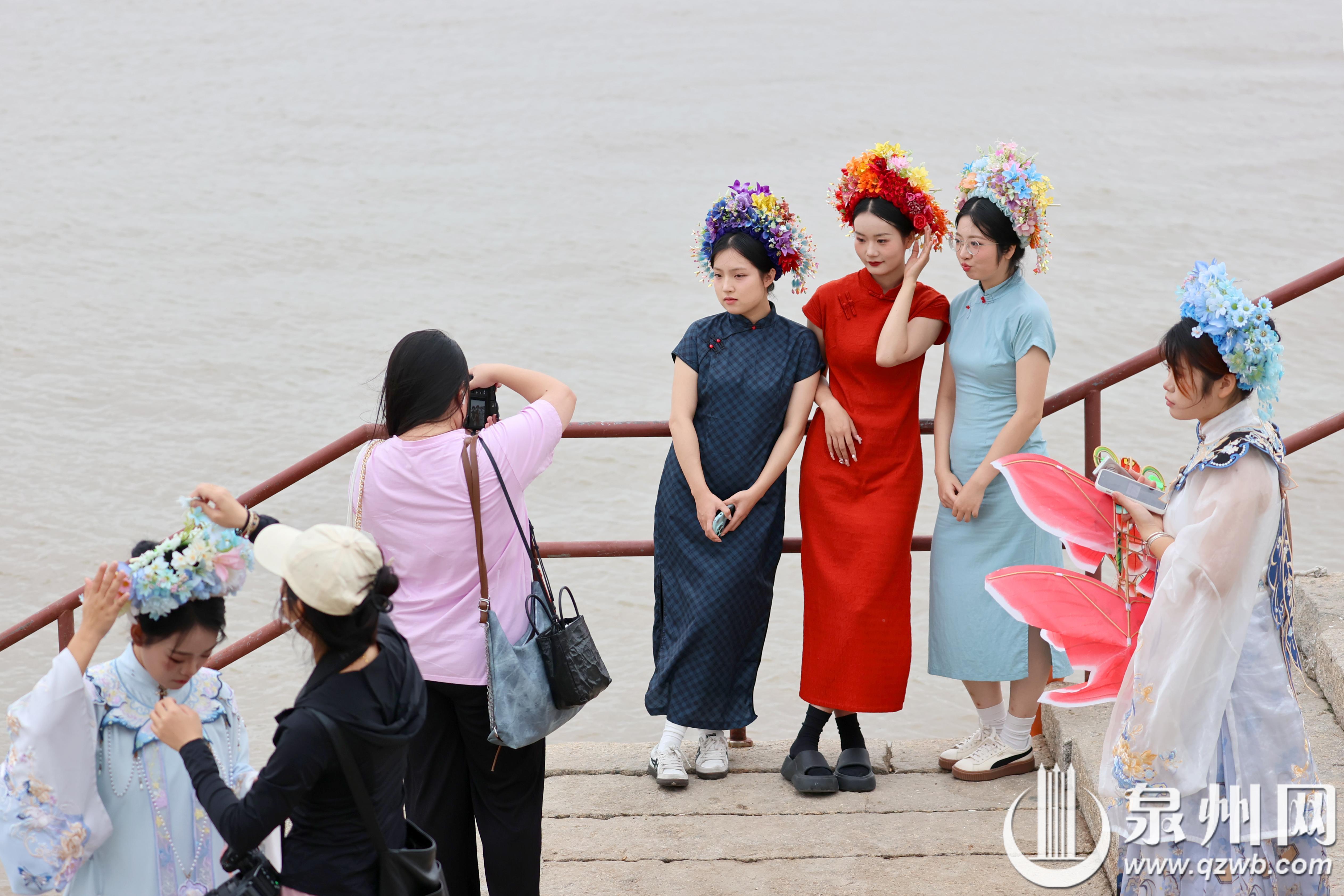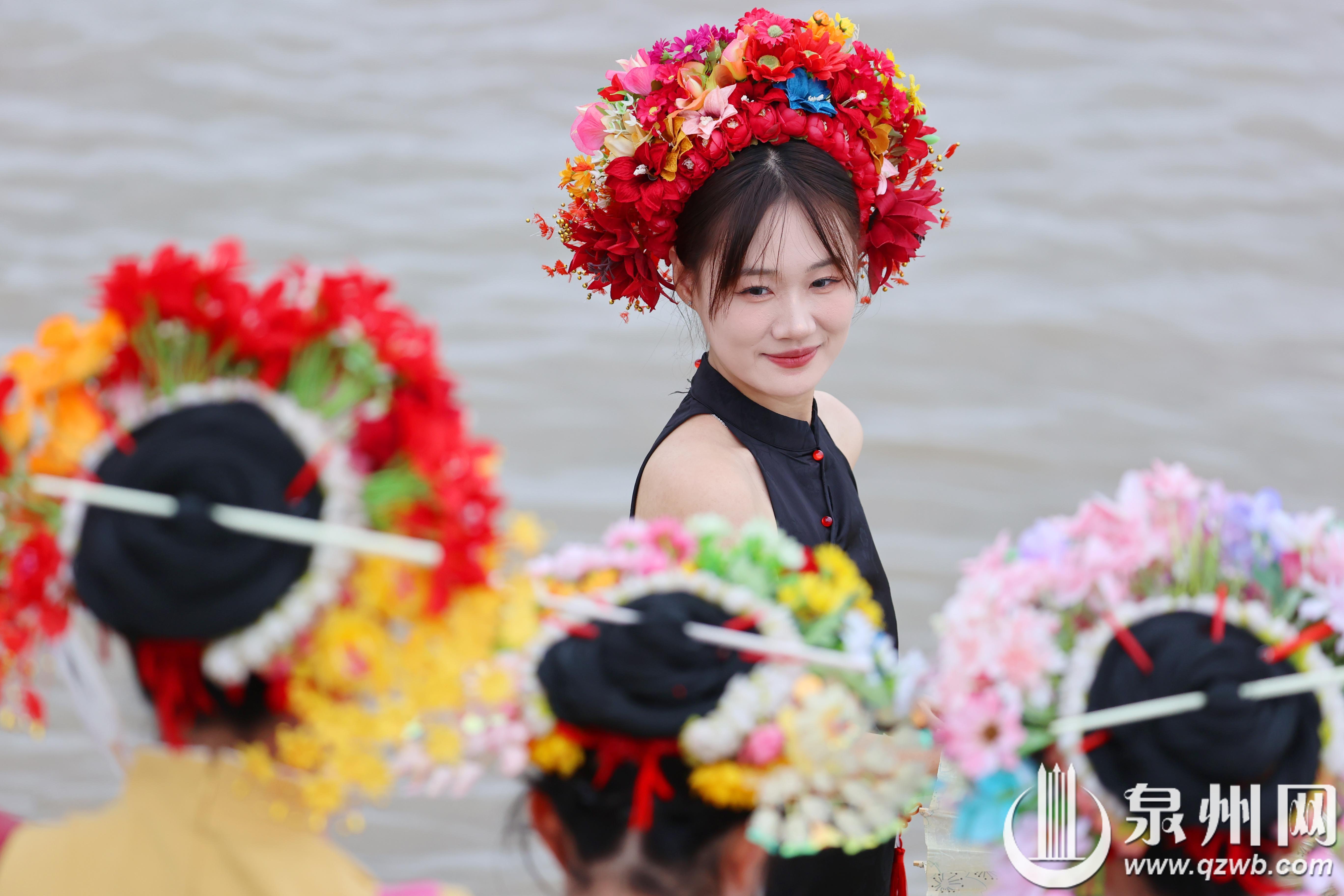 10月2日,国庆小长假第二天,一大早,泉州市丰泽区蟳埔社区的小码头暗香浮动,簪花摇曳。从各地慕名而来的爱美之人纷纷身着华丽服装,扮上精致妆容,在镜头前尽情展示自己最美的簪花围造型,留下值得回味的瞬间。(融媒体记者陈起拓 摄)