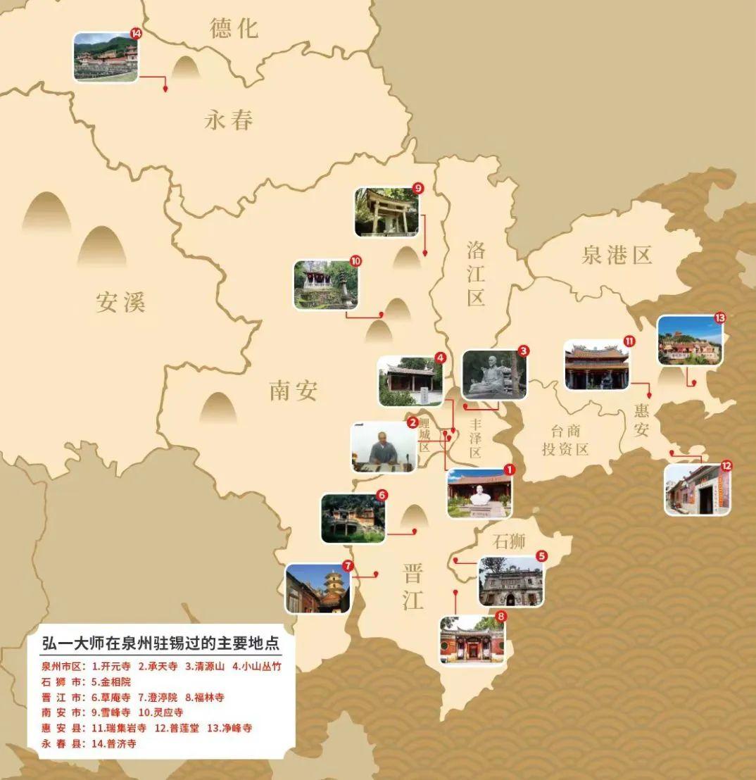 弘一大师的一生以出家为界,出家前他是中国近现代文化史上一位不可多得的艺术全才,出家后他精修佛教律宗,又成为佛门一代高僧。在他出家的24年里,最后14年留在了闽南,也与泉州结下了不解之缘,现在的泉州市区及石狮、晋江、南安、惠安、永春等地,众多寺庙内都留下了书法、诗赋、经律等遗墨珍品。