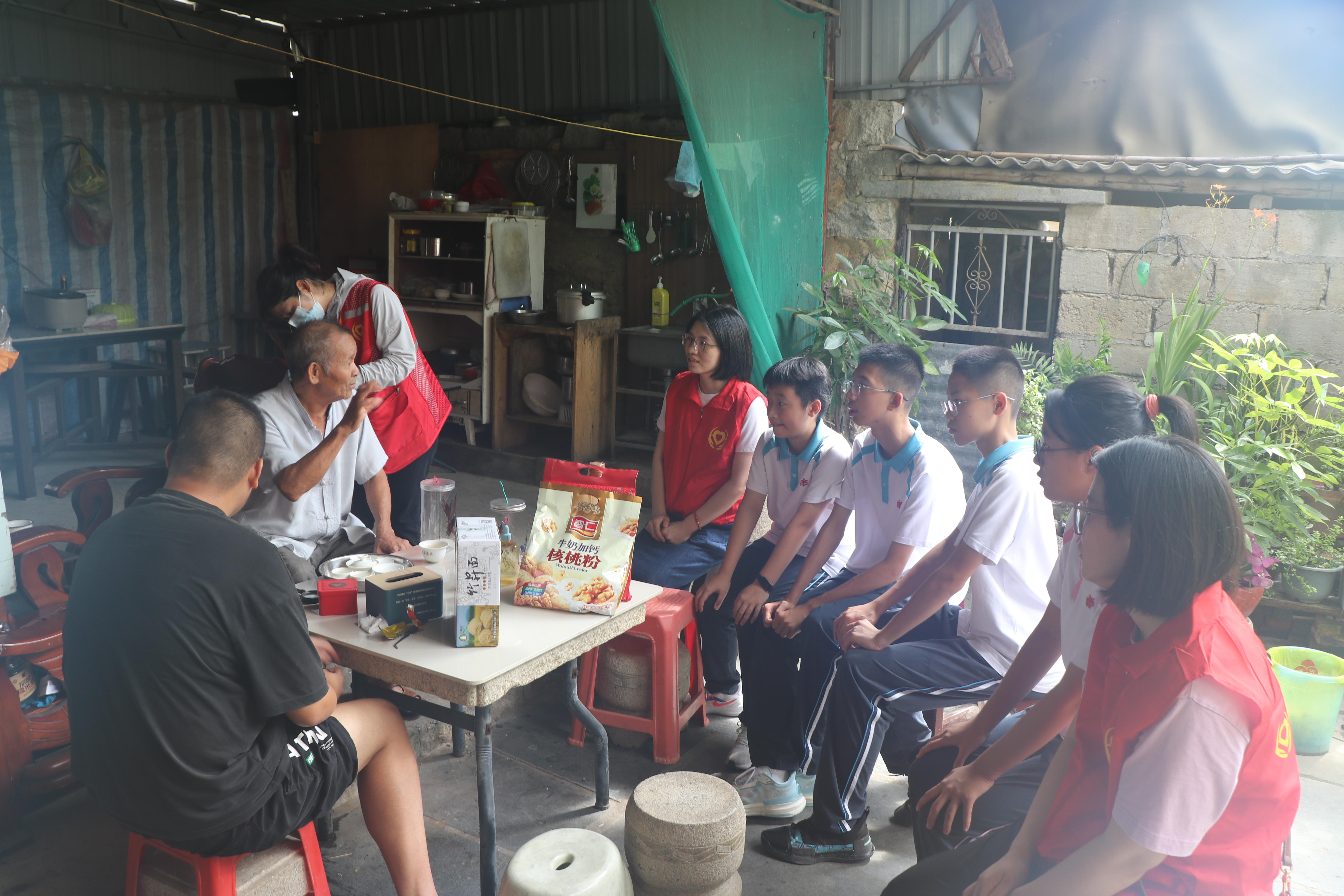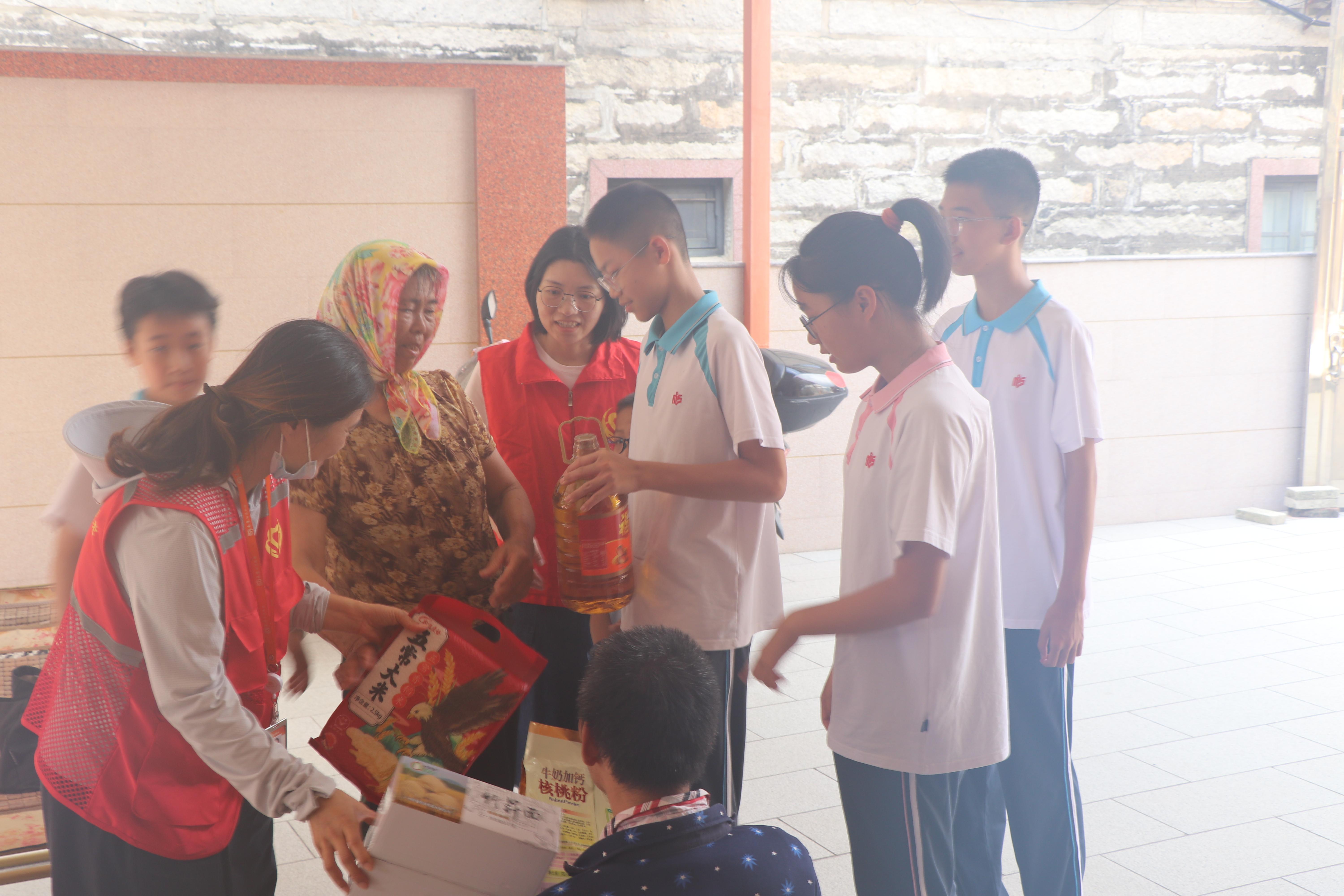 活动中,学生们分成8组,走访了16位困难群众,为他们送去生活物资和暖心慰问。在困难群众陈阿婆家中,来自初二年1班的同学们与阿婆拉家常、促膝交流,了解老人的身体和生活情况。陈阿婆的两个儿子都是残疾人,家庭经济十分困难,一家的生活都靠她支撑。同学们联合养老机构工作人员送去了米、油等物资,还帮忙扫地、擦桌子。