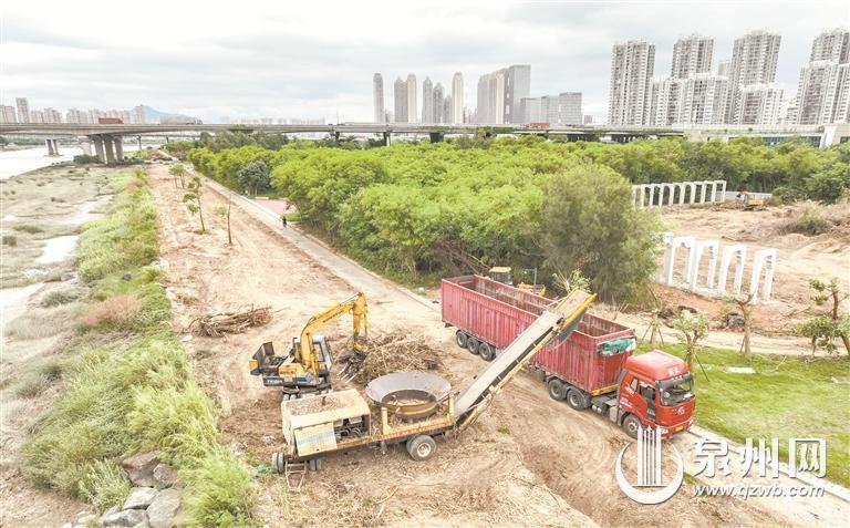 从东边的汀洲园彩虹桥走到西边的沉洲园听涛桥(与浦西园交界),慢道沿江的区域原本都是杂草、荆棘、荒树。记者看到,目前整段1公里多的沿江区域,已经基本平整完,施工机械和工人们正在对剩余以及周边一些区域进行清理平整,弯月台附近的“海丝共融”雕塑原本也是杂草丛生,将雕塑群掩盖了,目前草木也基本清理一空。