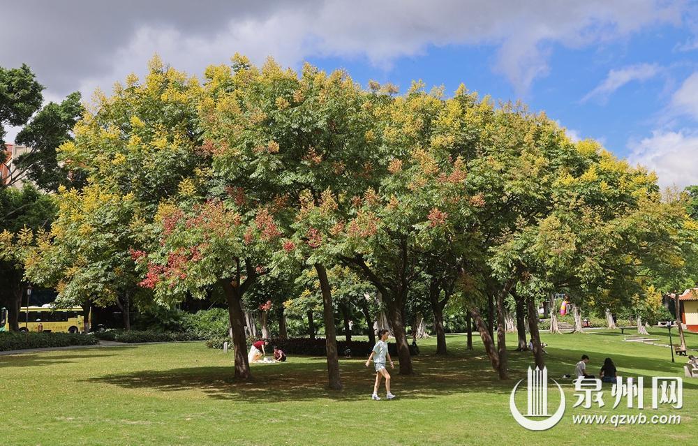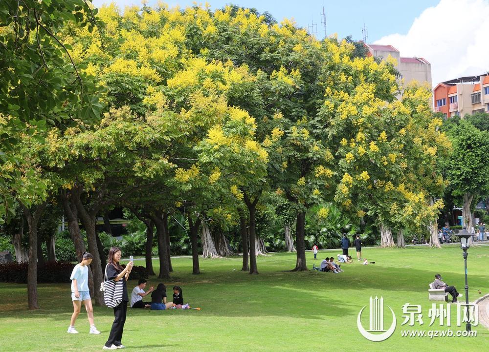 今天是重阳节,泉州秋高气爽,适宜登高望远赏美景。图为泉州西湖公园南侧的栾树花开,为秋日的泉州带来金色的“浪漫花雨”。(王柏峰 摄)