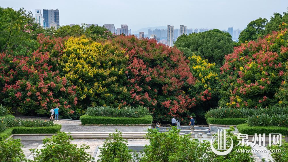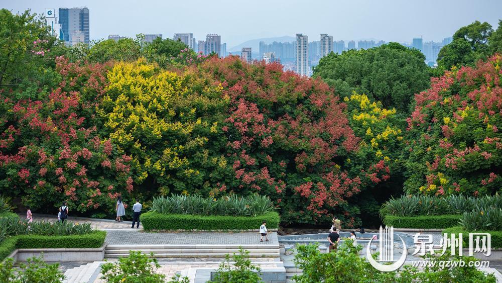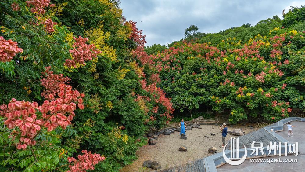 昨日,记者在市区大坪山云谷寺附近看到,成片的栾树开花结果,金黄色的花朵和红褐色的果实将树林渲染得色彩缤纷,不时有游客在树下拍照留念。