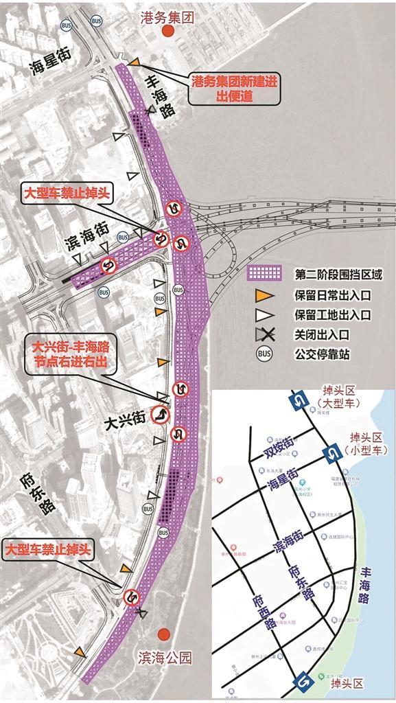 2024年10月25日—2027年5月17日,调整丰海路(双垵街—府东路)和滨海街(泉泰路—丰海路)交通组织:占用丰海路靠海一侧人行道、非机动车道以及东半幅车行道围挡施工,施工期间车辆导改至西半幅,保障丰海路双向四车道通行;占用滨海街主线车行道进行围挡施工,保障滨海街辅道双向四车道通行。