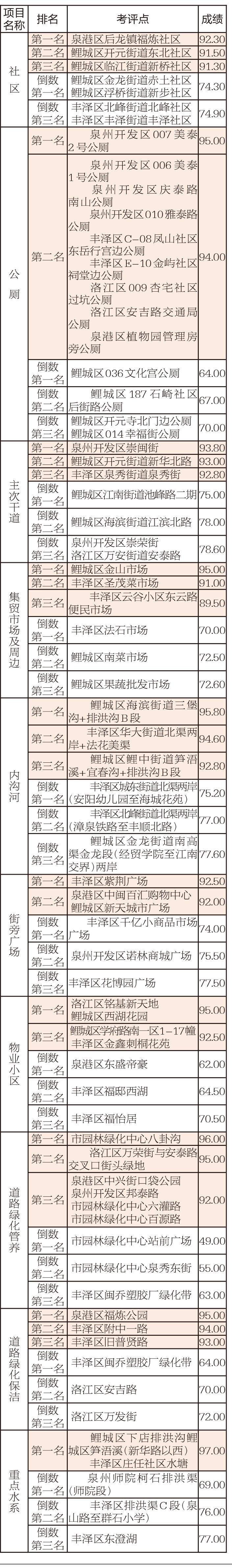 9月份,市城市管理局考评中心按照《泉州市市容和环境卫生综合考评工作方案》及其实施细则要求,对标城市精细化管理,进一步加强中心城区市容和环境卫生管理综合考评,共抽评69个社区、88条主次干道、100个住宅小区、40段内沟河、7条江岸带、29座街旁广场、33座集贸市场、83座公厕、58条道路绿化、12座公园、34段重点水系。各区综合考评成绩为:鲤城区,第一名,86.07分;泉州开发区,第二名,85.68分;洛江区,第三名,85.49分;泉港区,第四名,85.41分;丰泽区,第五名,85.35分。