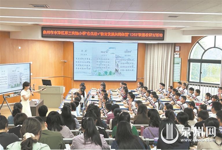 泉州网10月24日讯(融媒体记者林婷瑜 通讯员黄晓瑜 文/图)10月22日上午,丰泽区第三实验小学“名优校+”教育发展共同体暨“1253”联盟校研讨活动在丰泽区第三实验小学城东校区举行,来自丰泽区第三实验小学、丰泽区泉秀实验小学、丰泽区群石实验小学和丰泽区云谷小学等校的200多名教师齐聚一堂,参与此次活动。