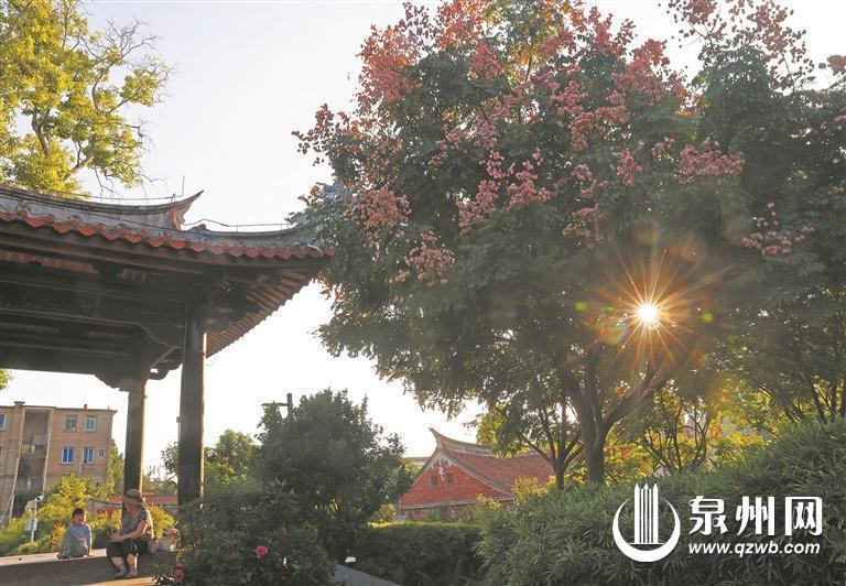 秋风起,秋意浓。位于小山丛竹历史文化主题公园的栾树,是泉州古城最近的热门打卡点。葱茏的绿叶之间,栾树火红的蒴果挂满枝头,与红砖厝、燕尾脊相映成趣。绽放的栾树,像傍晚的霞光,又像绽放的烟花,似乎无声宣告着盛夏的结束,引来游客如潮。
