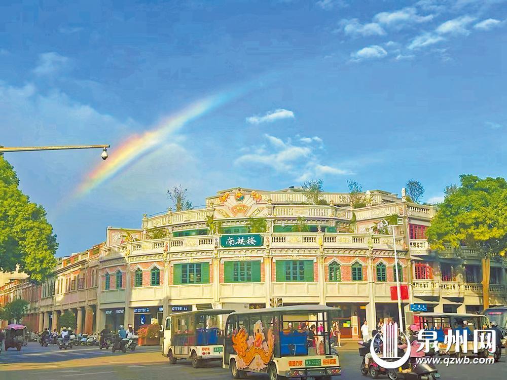 彩虹在泉州古城中山路上空画出美丽的弧线(李菁 柏峰 摄)