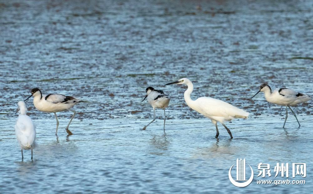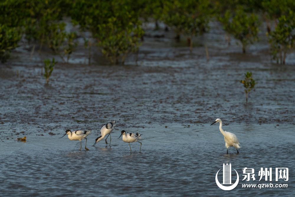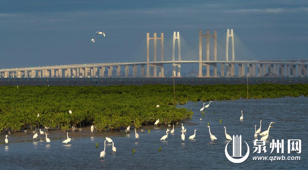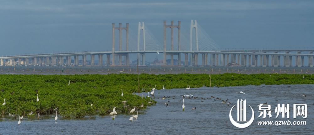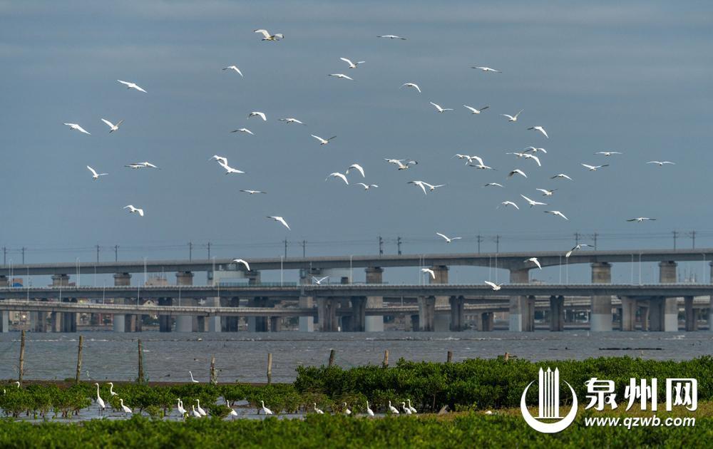 11月8日,在泉州湾畔远眺,蓝色海湾-鸟类监测塔附近海域的红树林一带,鸟儿聚集觅食。它们中,除了常见的留鸟白鹭、大白鹭,还能看到反嘴鹬、青脚鹬等候鸟。随着泉州持续加强湿地生态修复,海洋生态和水体环境持续向好,远道而来越冬的鸟儿越来越多。进入11月,将有更多南迁候鸟来泉。据统计,截至今年9月,泉州观察记录到鸟类395种,其中,国家一级保护动物21种,国家二级保护动物82种,在全省名列前茅。(融媒体记者陈起拓 摄)