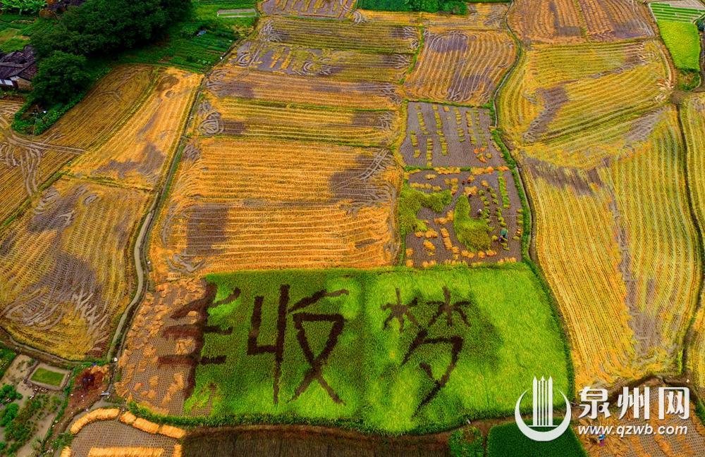 张联财用不同品种的水稻种出“丰收梦”的字样,他培育的优质稻已在福建省推广种植超200万亩(摄于2016年7月14日)。