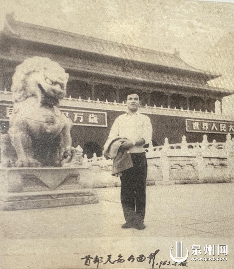 1963年,蔡友辉在北京演出《连升三级》后,在天安门前留影。(蔡黛红/供图)