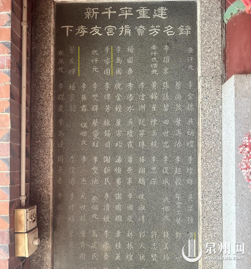 河岭巷旁的下孝友宫捐资芳名录上,可以看到蔡友辉和邻居黄奕缺,还有著名学者李亦园。