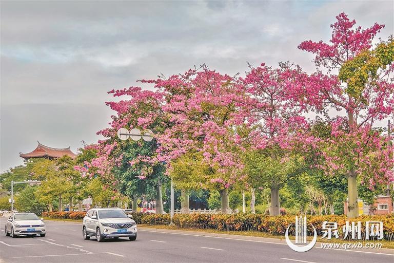 眼下,泉州市区江滨北路临漳门至顺济桥路段,樱花木棉开出粉色花朵,扮靓中分绿化带,令人赏心悦目。据悉,樱花木棉的树干膨大,腆着“大肚子”,所以又被称为酒瓶木棉、大腹木棉。