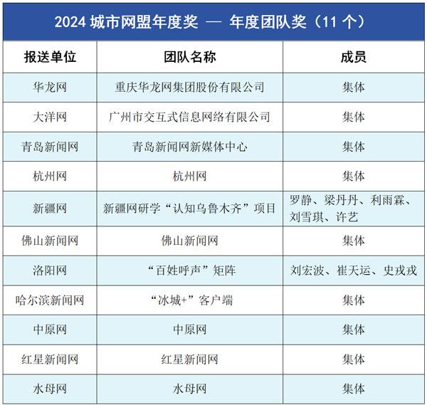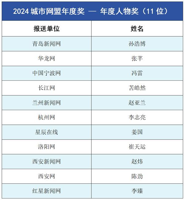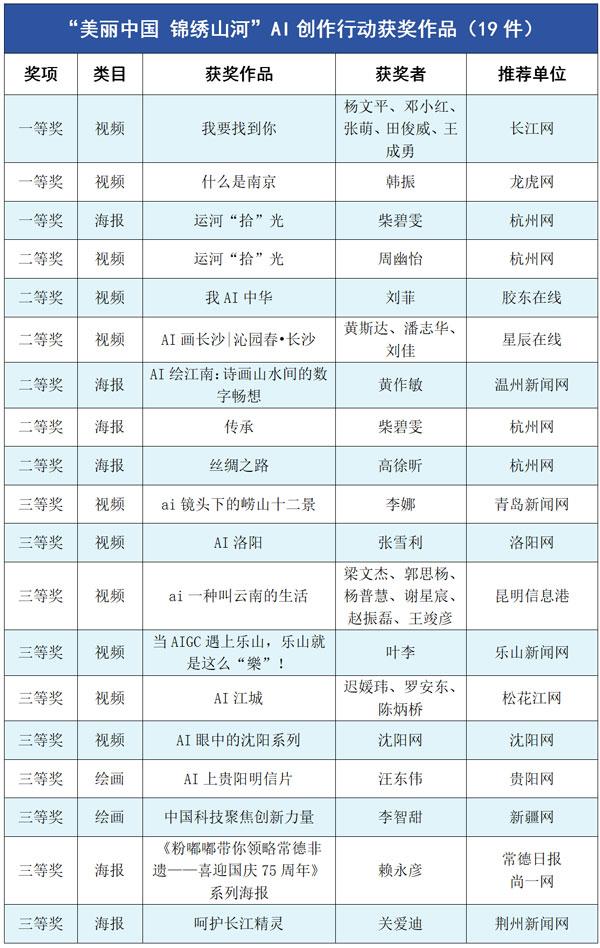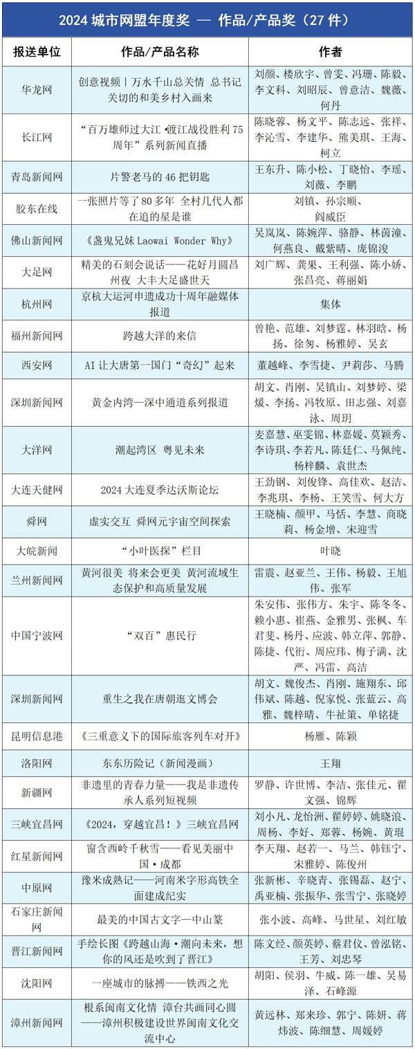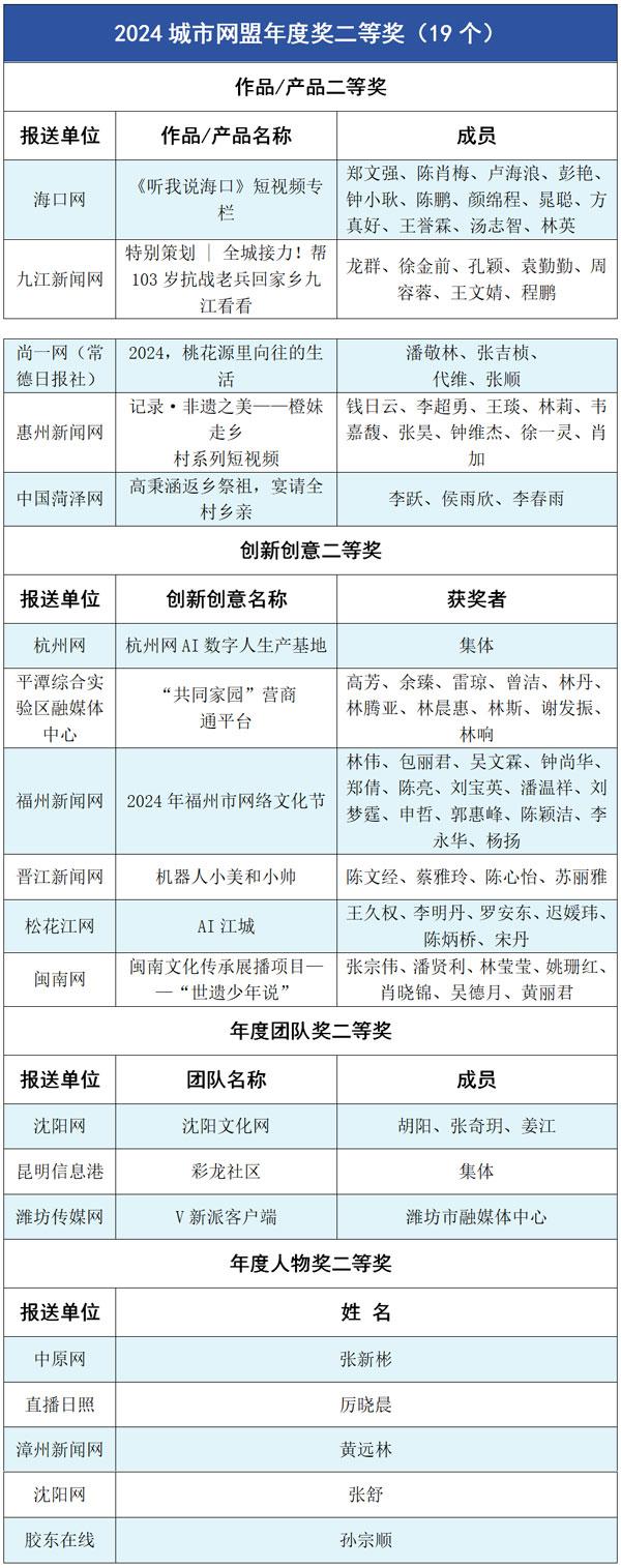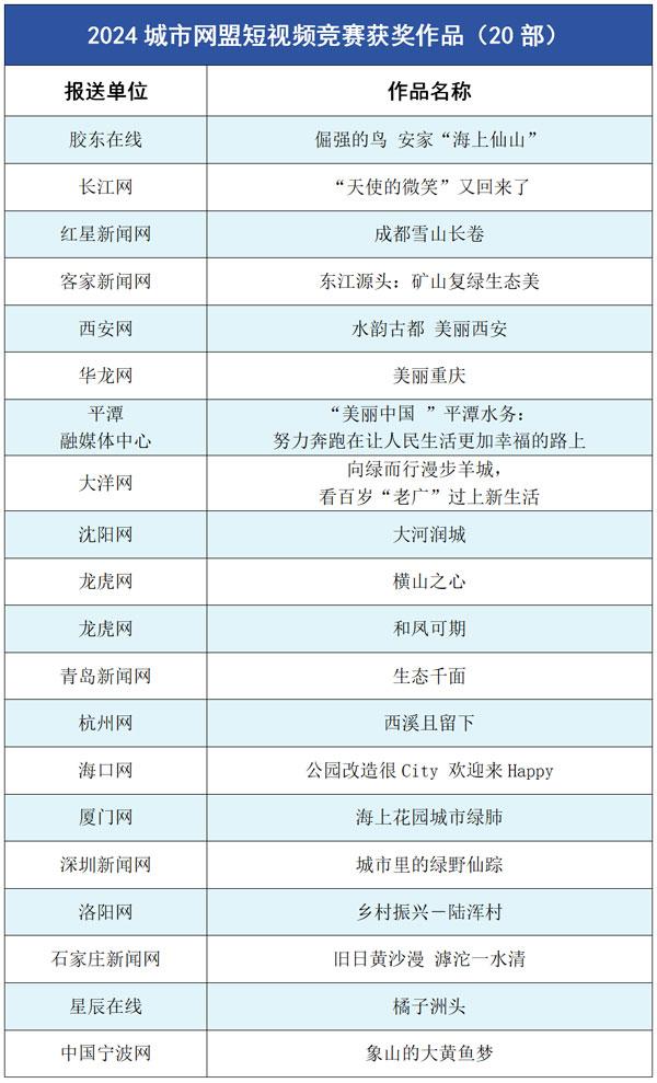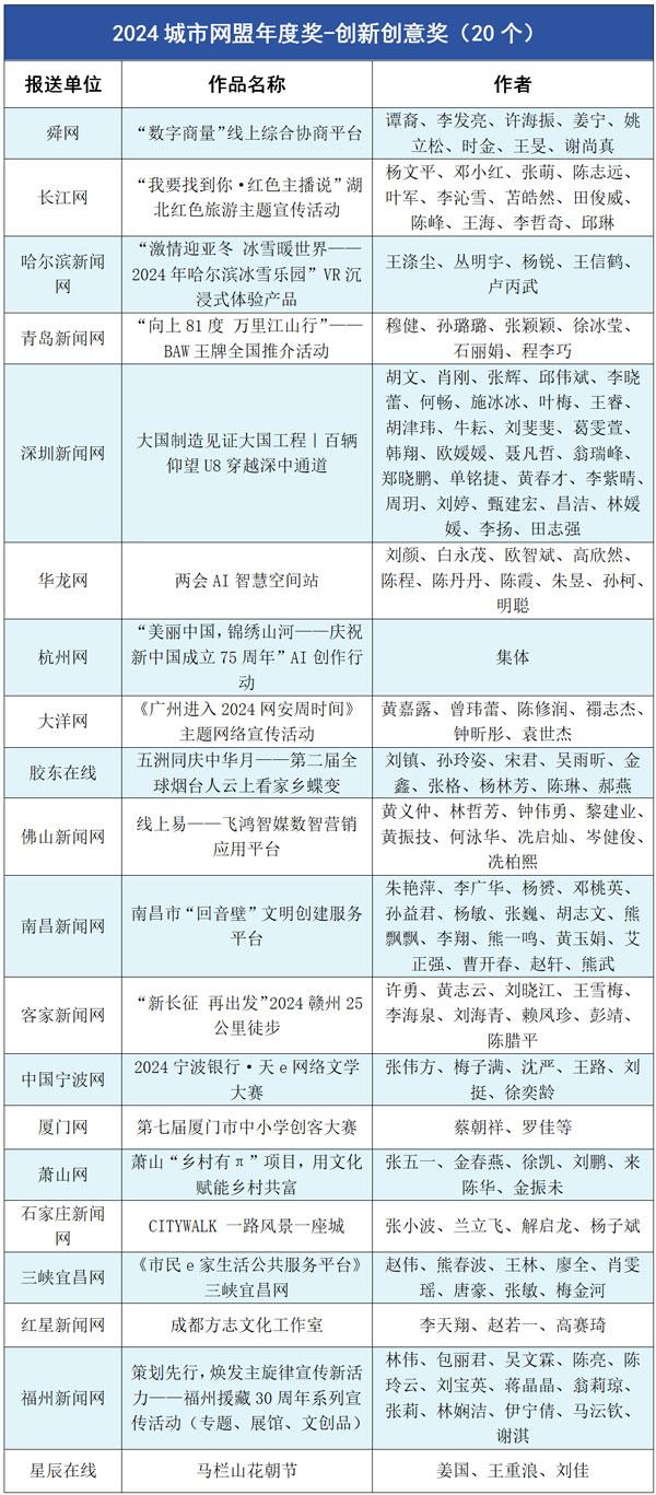 胶东在线《倔强的鸟安家“海上仙山”》等20部作品获年度竞赛最佳短视频奖;长江网《我要找到你》等19件作品被评为“美丽中国锦绣山河”AI创作优秀作品。孙浩博等11人获“城市网媒年度人物奖”;华龙网等11个团体获“城市网媒年度团队奖”;华龙网《创意视频|万水千山总关情总书记关切的和美乡村入画来》等27件作品/产品获“城市网媒年度作品/产品奖”;舜网《“数字商量”线上综合协商平台》等20个策划、活动获“城市网媒年度创新创意奖”;另有11件作品、3个团队、5人获“城市网媒年度奖二等奖”。