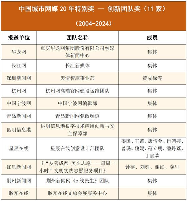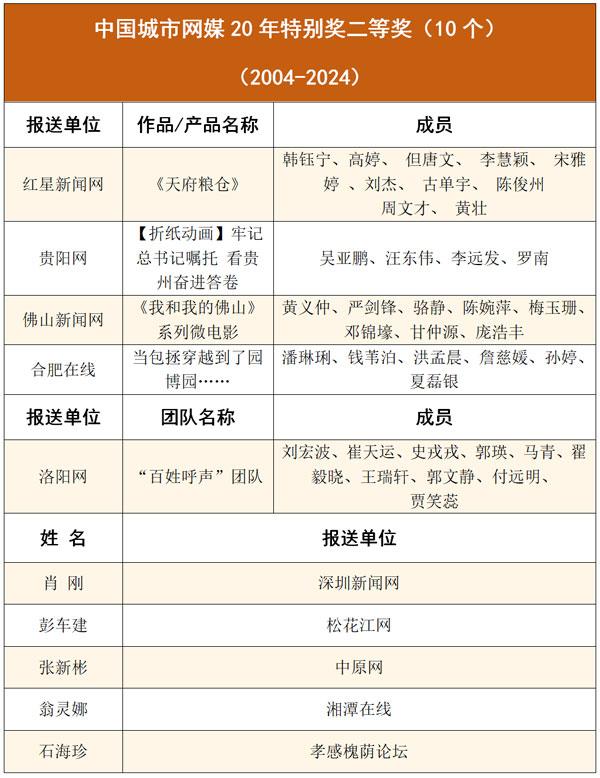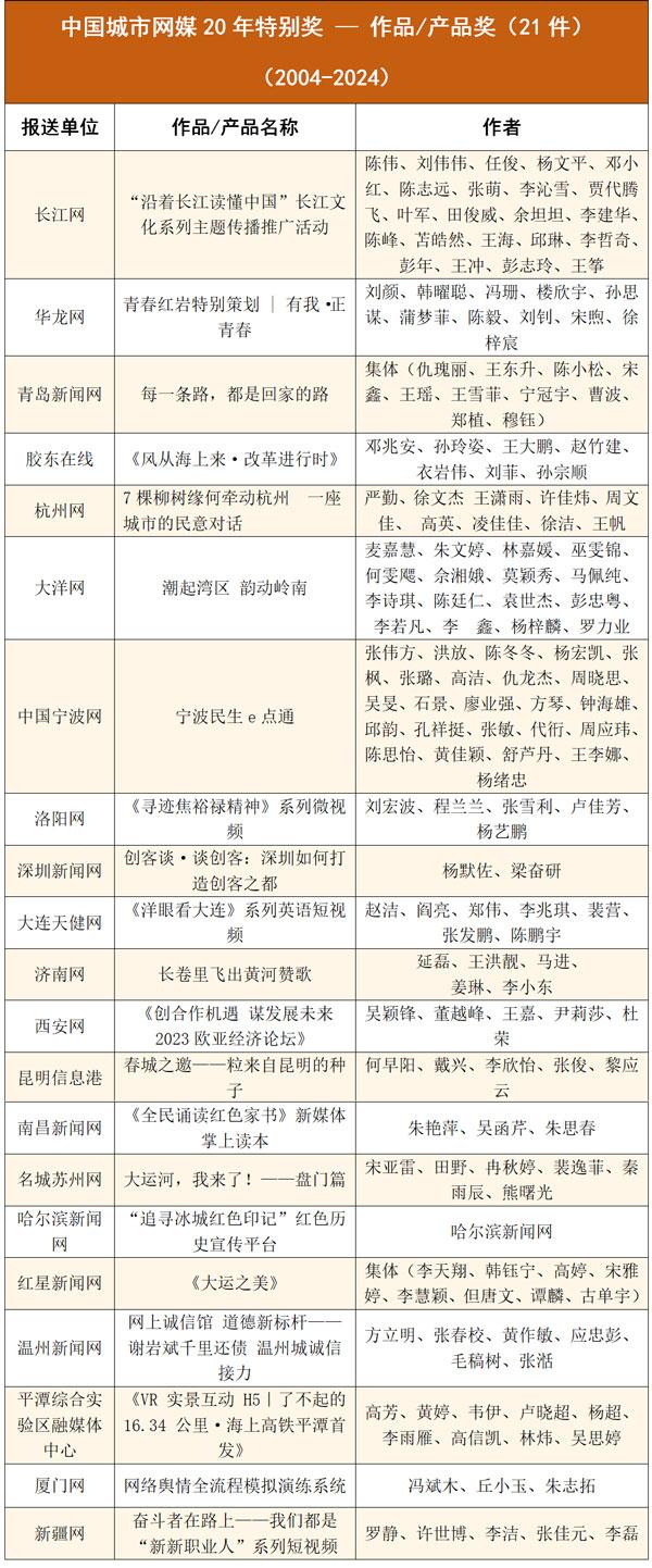 孙瑜等20人获“城市网媒20年特别奖-突出贡献奖”;重庆华龙网融媒体新闻中心等11个团队获“城市网媒20年特别奖-创新团队奖”;长江网《沿着长江读懂中国》等21件作品/产品获“城市网媒20年特别奖-作品/产品奖”;另有4件作品/产品、1个团队、5人获“城市网媒20年特别奖二等奖”。