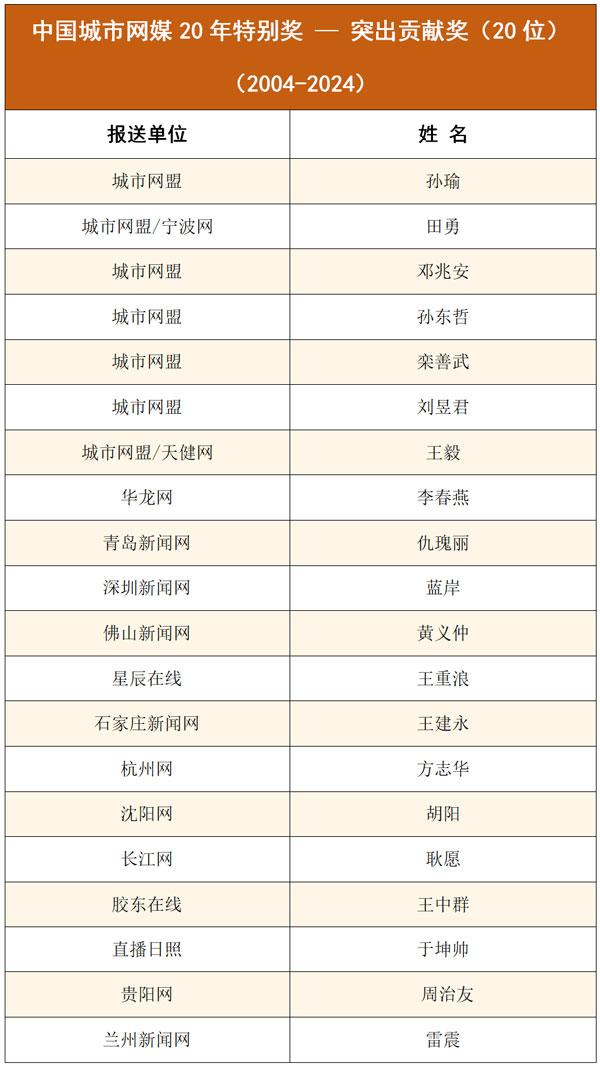 2024年是中国城市新闻网媒联盟成立20周年,也是多数地方新闻网媒成立20年的时间节点。为了全面展示我国城市新闻网媒20年创新发展成果,大会还颁发了“城市新闻网媒(2004-2024)20年特别奖”。