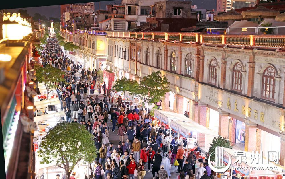 昨晚,2024年“中华美食荟”·首届中国(泉州)丝路小吃节暨国际美食嘉年华系列活动开幕式在泉州影剧院前广场举行。图为昨晚中山路热闹非凡,琳琅满目的美食吸引市民、游客驻足品尝。 (融媒体记者陈小阳 摄)