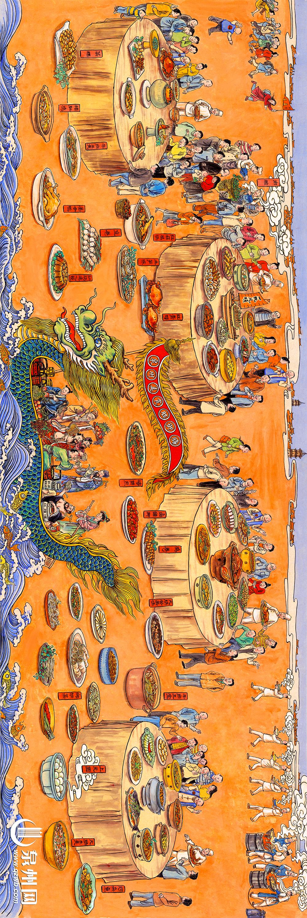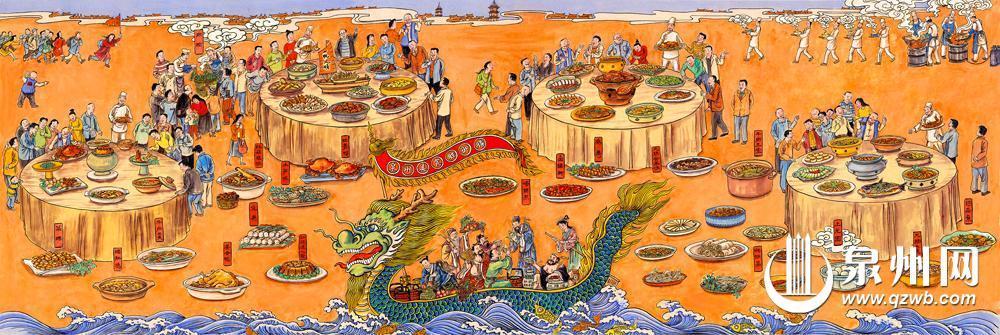“该画作是为泉州申创‘世界美食之都’而量身定做的。在创作手法上,我采用中国画长卷的表现形式+中国重彩画的表现手法,以此体现泉州美食的汲古出新。画面之中,我勾勒出五个‘阿福’形象,巧妙寓意‘五福临门’,承载着祥瑞之意。另外,我绘就八仙为泉州美食所诱,驾乘龙舟(恰值龙年象征)疾驰而至之景,着意表现‘八仙过海,闻香急驶古泉州;五福临门,品味飞奔锦刺桐’的意境。”洪志雄解说道。