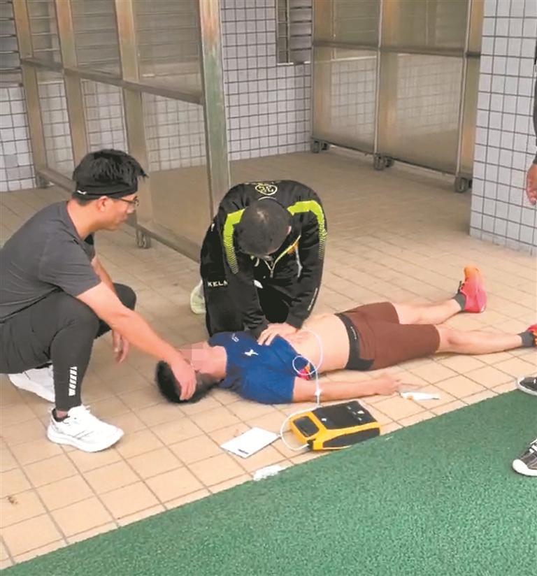 据张强东介绍,事发时,他刚好带着孩子在晋江市体育中心运动,并遇到同事余刚。15时17分许,余刚给他打来电话称,有名男子晕倒,急需医疗援助。张强东马上冲向该男子晕倒的地方。“我到达时,已经有人在给男子进行胸外按压,该男子脸色发紫,一旁有人称其呼吸心搏骤停。这种情况必须要用AED辅助抢救才有希望。”张强东说,平时常来运动,出于职业习惯,他会特别留意体育中心AED的位置。于是,他跑到七八十米外取来AED。