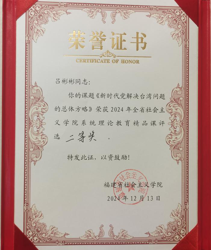 12月11日至13日,福建省社会主义学院组织开展了2024年全省社会主义学院系统理论教育精品课评选活动,共有来自全省社院系统的19位老师参赛。经激烈角逐和专家评审,中共泉州市委党校吕彬彬老师课程《新时代党解决台湾问题的总体方略》和张燕红老师课程《坚持好发展好完善好中国新型政党制度》以全省第3名及第4名的好成绩荣获本次活动二等奖!