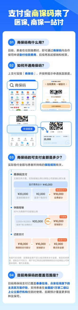 为了提升看病报销服务体验,12月13日,支付宝宣布推出商保码,实现医保、商保一站支付。患者住院缴费刷完医保后,如需补充,可直接使用商保码申请垫付住院费用,后续再向保司发起报销理赔。目前,用户上支付宝搜“商保码”可开通该服务,并按照提示申请就医额度。据悉,商保码首期已覆盖泰康在线、众安在线旗下的主流百万医疗险,为超过1000万用户提供服务,后续将覆盖更多保险机构及险种。