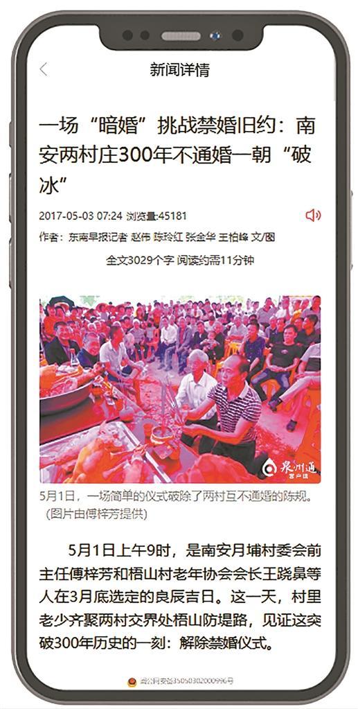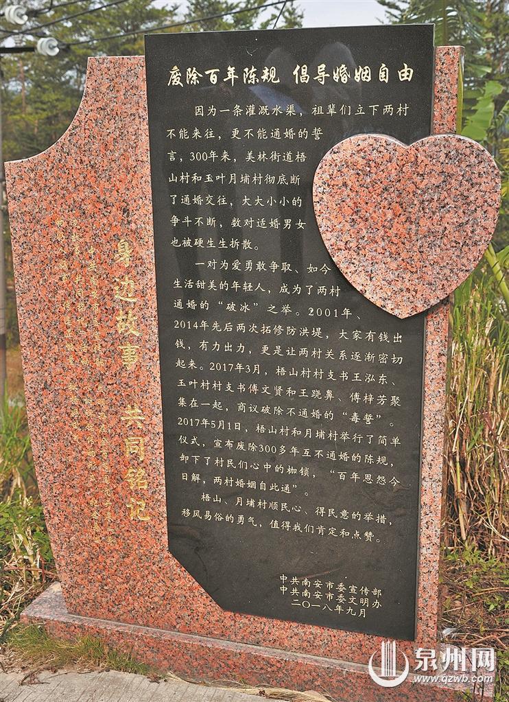 泉州网12月18日(融媒体记者 陈玲红 王柏峰 通讯员 林婧 文/图)2017年5月1日,对南安市美林镇梧山村和玉叶村月埔自然村来说是一个可以载入村志的日子。这一天,一场隆重的“破冰”仪式在两村交界处防洪堤坝上举行,两村以传统的方式祭告先辈,彻底结束“不通婚”旧俗,300年禁婚一朝“破冰”。如今7年过去了,当地至少新增了6对两村通婚夫妻,也影响和带动了周边十余个禁婚村落打破旧俗,两村村民在文化娱乐、人情往来上更加密切了,成为真正的“邻居”。为此,南安市委宣传部、文明办还特意在两村交界处立碑,表扬两村移风易俗的好风气。