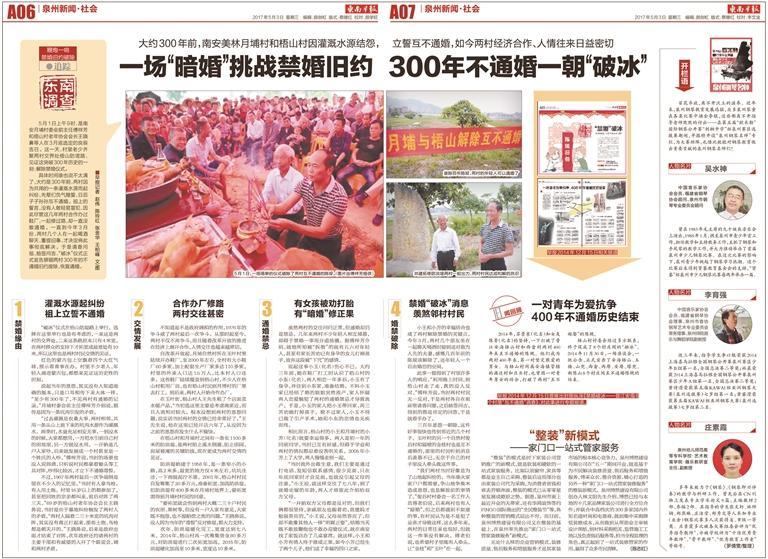 2017年5月3日,《东南早报》以《一场“暗婚”挑战禁婚旧约 300年不通婚一朝“破冰”》为题报道了两村打破旧俗之举,引发多方关注。据傅梓芳介绍,此后新京报、央视等多家媒体都关注到此事,并再次聚焦报道。两村解除禁婚的新风尚传开后,包括南安市诗山镇联星村、联山村等十余个村子也纷纷破除旧俗,恢复通婚,形成移风易俗的好风气。