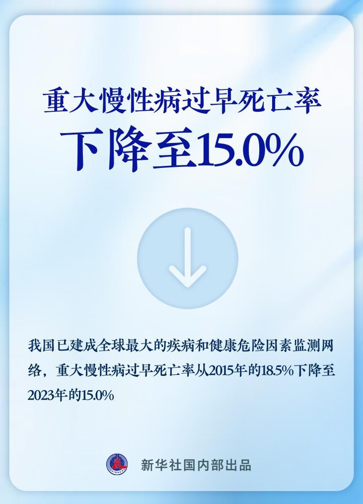 近年来,我国已建成全球最大的疾病和健康危险因素监测网络,重大慢性病过早死亡率从2015年的18.5%下降至2023年的15.0%。